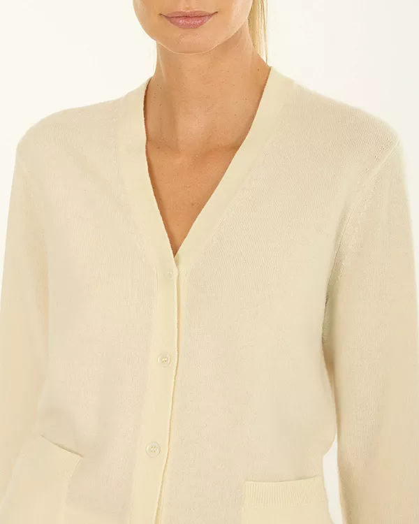 Кардиган Jacqueline, связанный из роскошной смеси 90% шерсти и 10% кашемира, воплощает в себе непринужденную элегантность и комфорт. Модель имеет свободный V-образный вырез, ребристую отделку и пуговицы в тон.