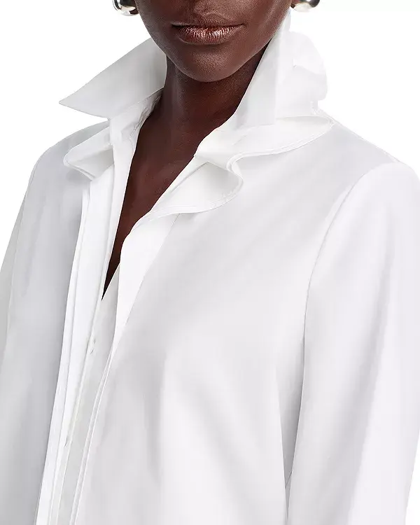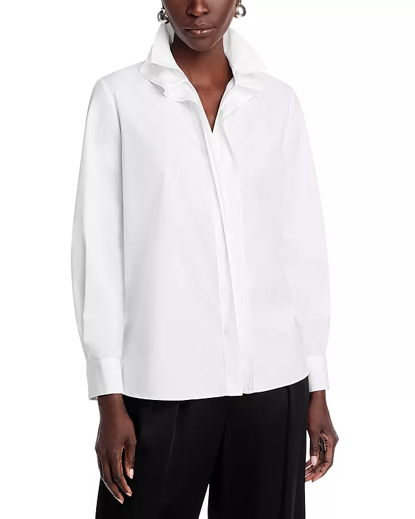 Многослойный воротник с оборками переходит в многослойную отделку планки