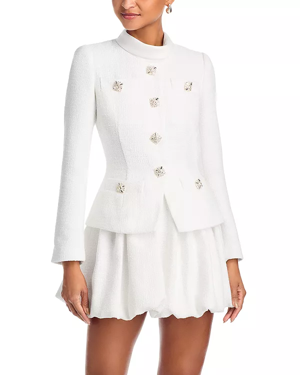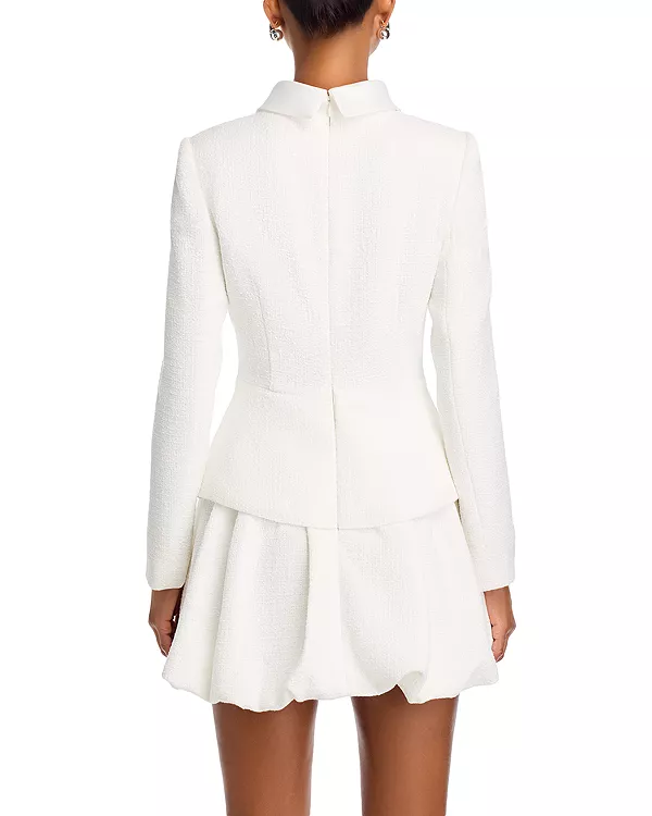 Миниатюрная юбка-«пузырь» придает этому кремовому платью из букле игривую энергию. Платье сшито так, чтобы выгодно подчеркивать фигуру, а крупные пуговицы, украшенные стразами, добавляют гламура - идеально подходит для коктейльных вечеринок и светских приемов.
