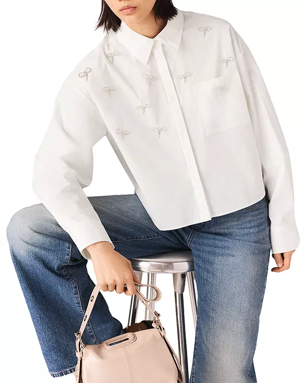 Эта укороченная рубашка Maje из хлопкового поплина, украшенная бантиками из сверкающих стразов, играет со светом и добавляет блеска вашему повседневному образу; ее свободный крой обеспечивает современный вид и свободу движений.