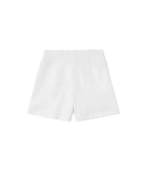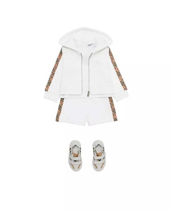 Шорты из хлопковой ткани с петлевым плетением, отделанные по бокам клетчатой лентой Burberry в фирменном бежевом цвете из архива. Модель украшена вышивкой в виде рыцаря-всадника в тон.