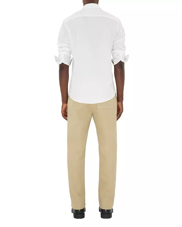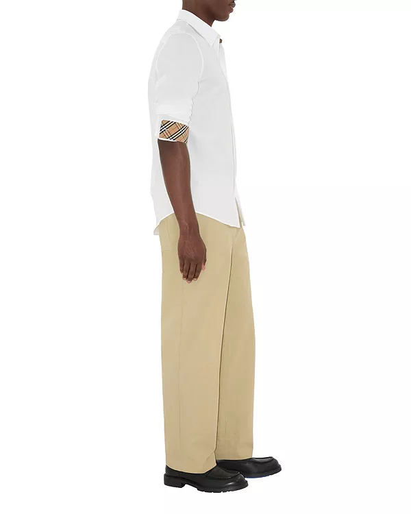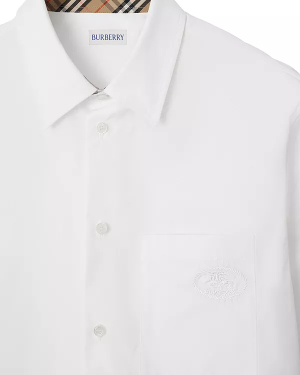 Бренд: Burberry Цвет: белый Рубашка из итальянского хлопкового поплина, прямого кроя. Модель украшена вышивкой в виде рыцарского узора в тон ткани - архивного мотива, впервые появившегося на сумках Burberry в 1980-х годах. Подверните манжеты, чтобы увидеть подкладку в клетку Burberry.