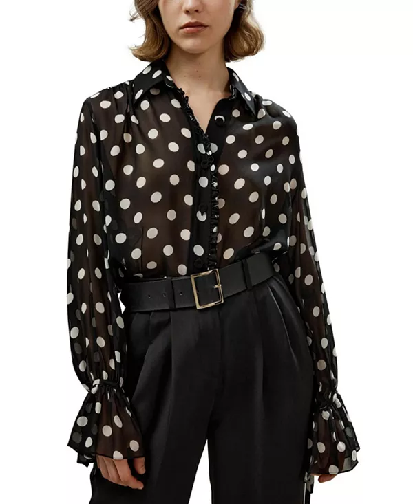 Бренд: Lilysilk Цвет: черный В горошек мы переносимся в 20-й век и можем танцевать от души. Особенно легкий жоржет обеспечивает комфортную посадку и легкую прозрачность, создавая эффект «выглядывающего силуэта». Длинные рукава-банты и декоративные оборки на застежке на пуговицы придают блузке легкость и свежесть. В зависимости от вкуса, блузку можно сочетать с брюками или юбками, чтобы уверенно чувствовать себя как на работе, так и на свидании.