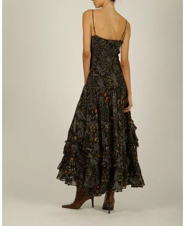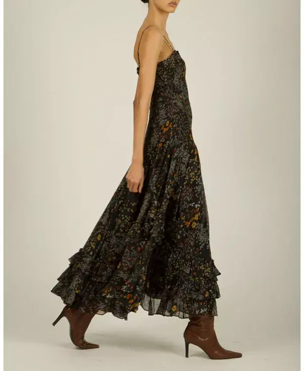 Платье Paulina, изготовленное из 100% органического шелкового шифона, отличается нежной, воздушной текстурой и изящной драпировкой. Тонкие бретельки, облегающий лиф и многоярусная юбка с принтом «Дикие цветы» создают прекрасное движение, излучая женственное очарование и плавность.
