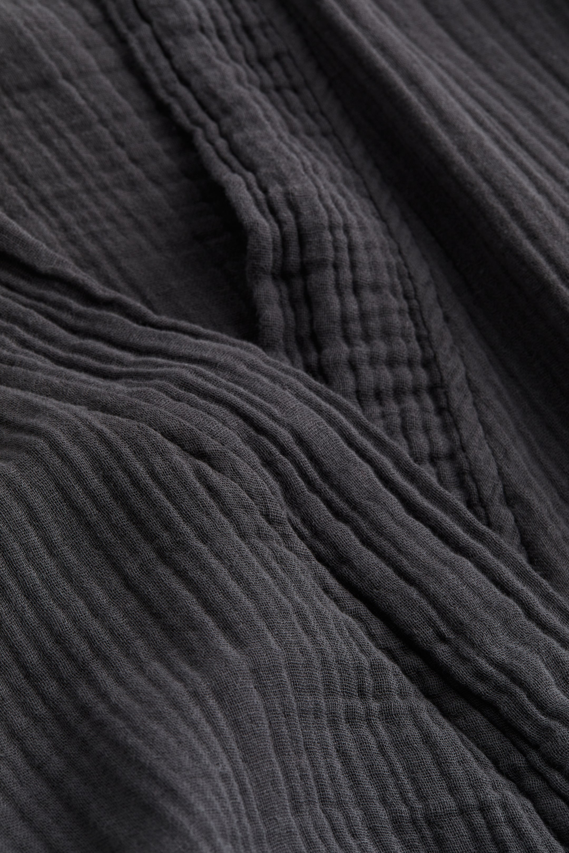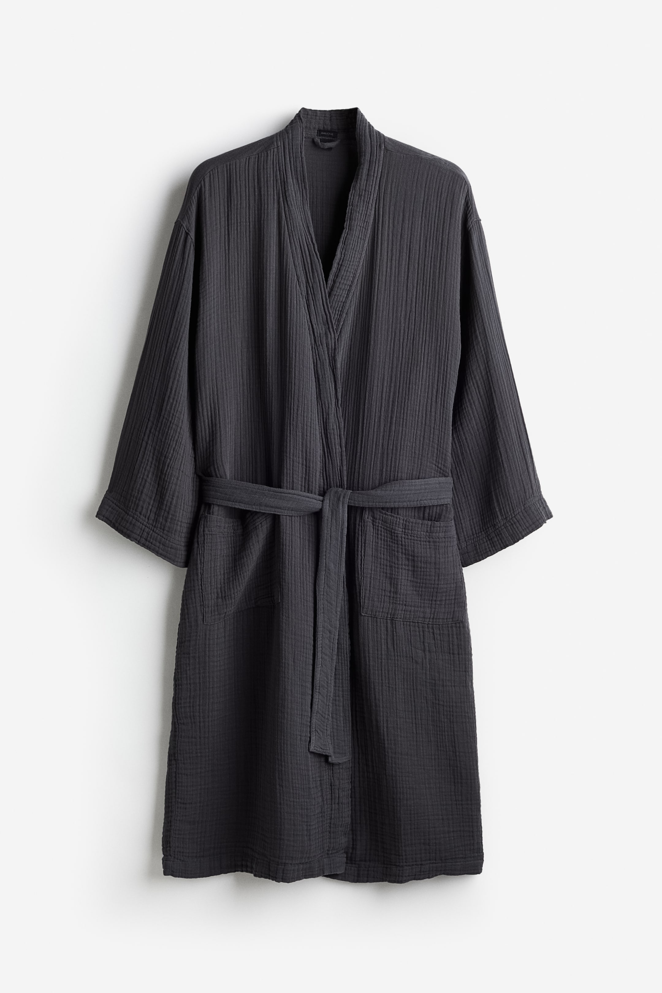 Мягкий хлопковый муслиновый халат с воротником-шалью. Съемный пояс на талии и передние накладные карманы.