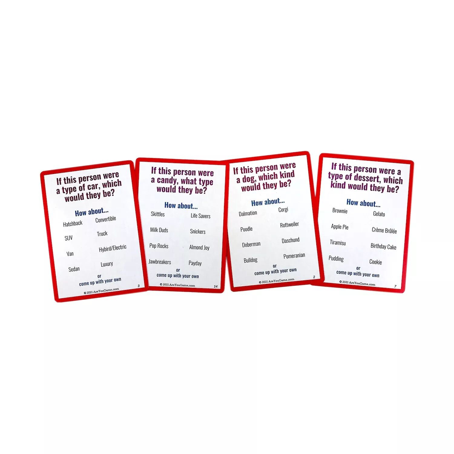 Перетасуйте колоду карт и поместите ее лицевой стороной вниз в центре игровой зоны. Это карточки с вопросами. Игроки кладут блокнот и ручку (не входят в комплект) рядом с карточками.