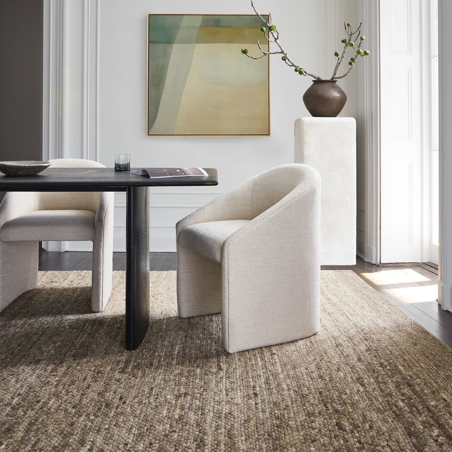 Этот состав (шерсть + джут) делает ковер более фактурным и износостойким по сравнению с вариантом из вискозы, но при этом он сохраняет натуральный вид благодаря неокрашенным волокнам.