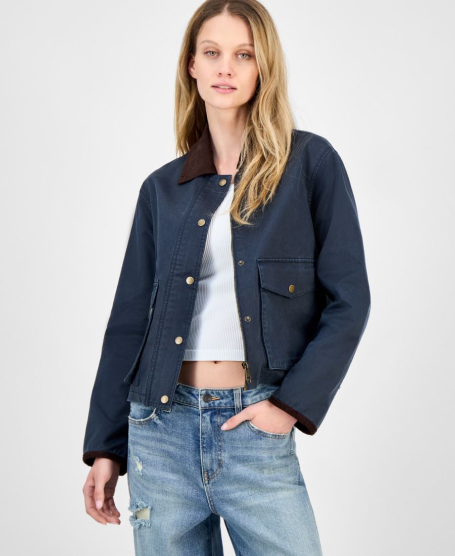 Вельветовый воротник; застежка-молния спереди с накладкой на пуговицу