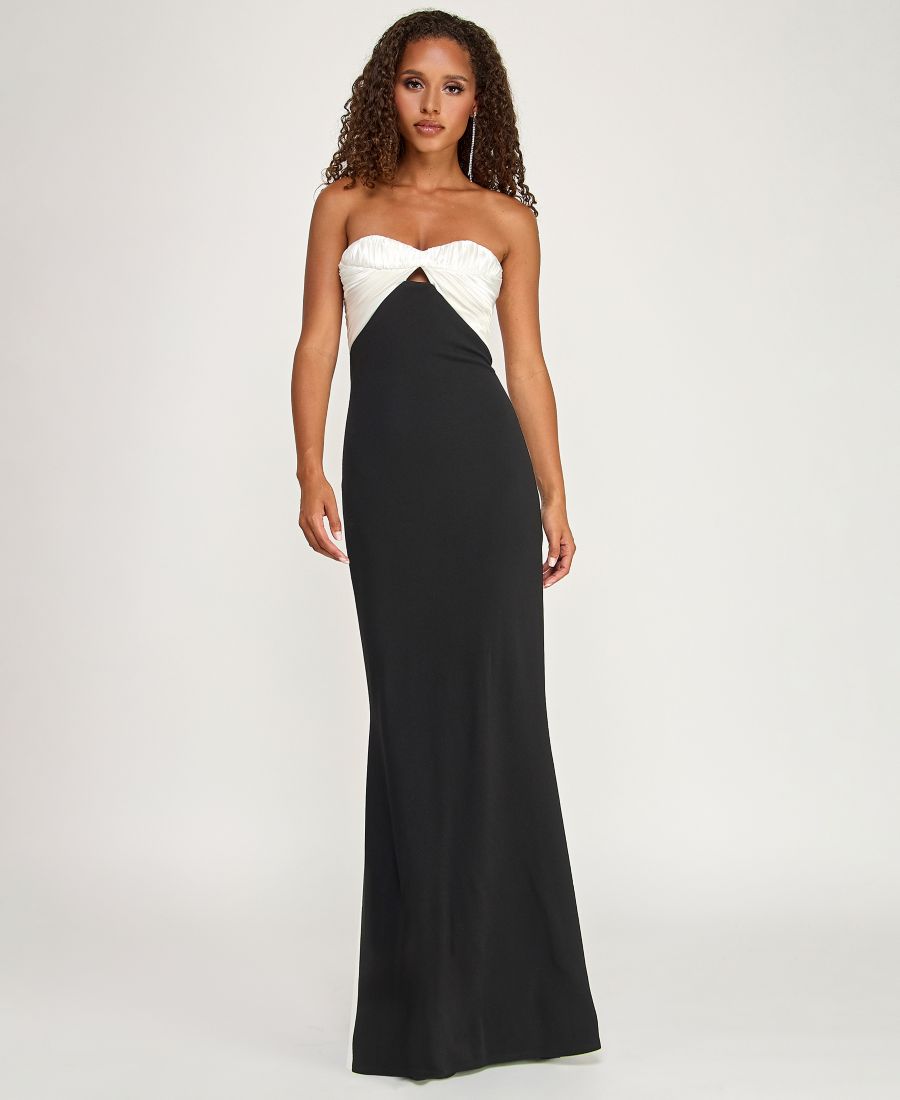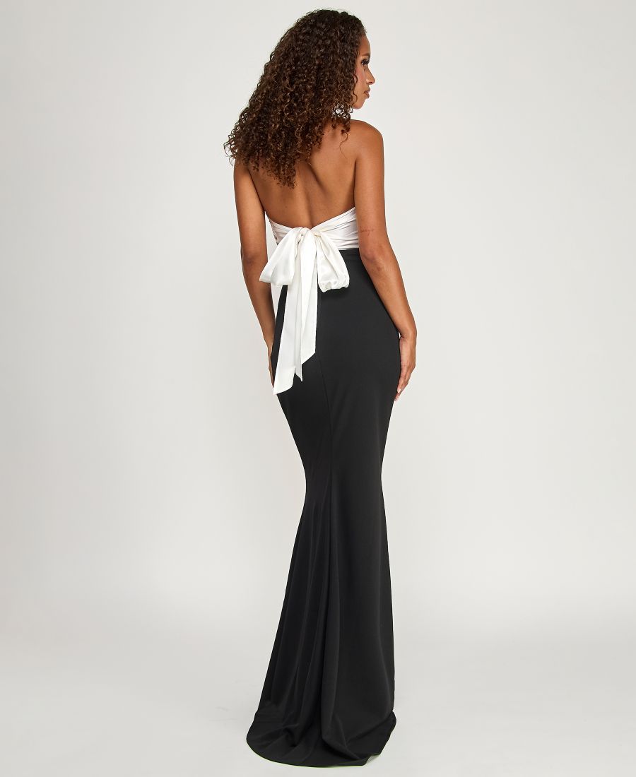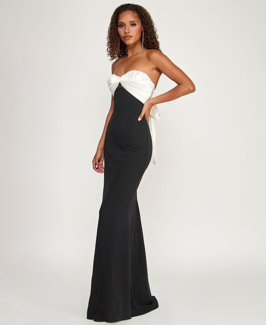 Создайте эффектный силуэт с помощью этого платья от City Studios с открытым лифом, присборенным и завязывающимся сзади. Его узкая длинная юбка плавно переходит в элегантный шлейф, создавая пленительный и торжественный образ.