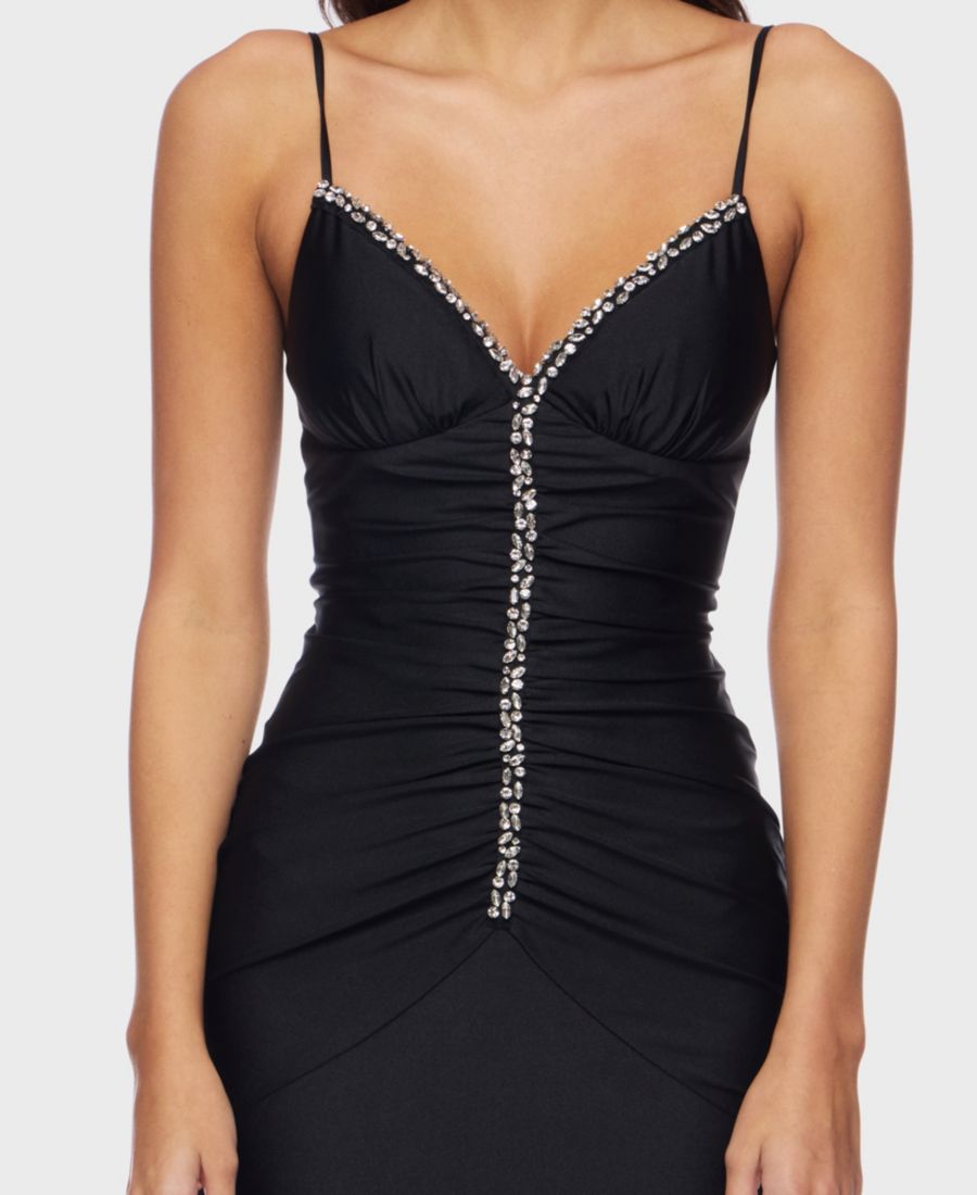 Это платье от Alex & Sophia, украшенное стразами спереди, имеет зауженную талию для создания привлекательного силуэта. V-образный вырез и застежка-молния сзади придают ему элегантный и лаконичный вид.