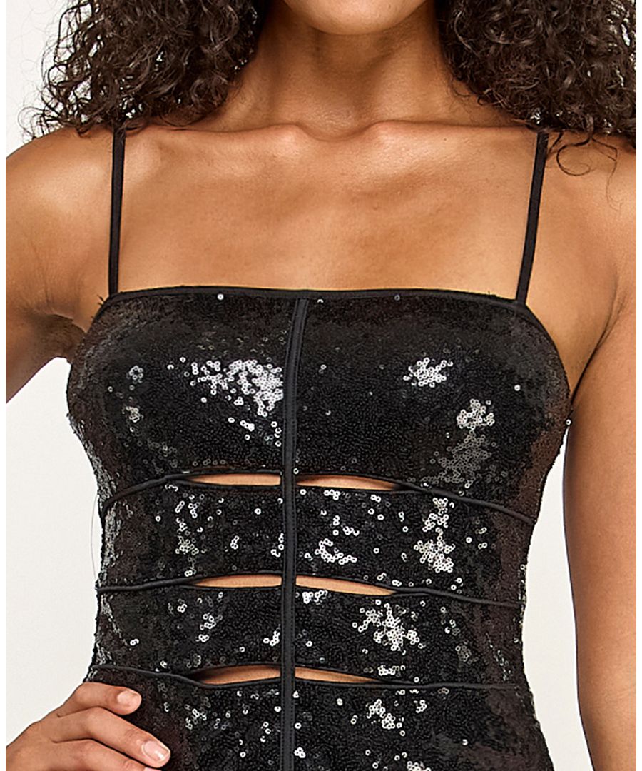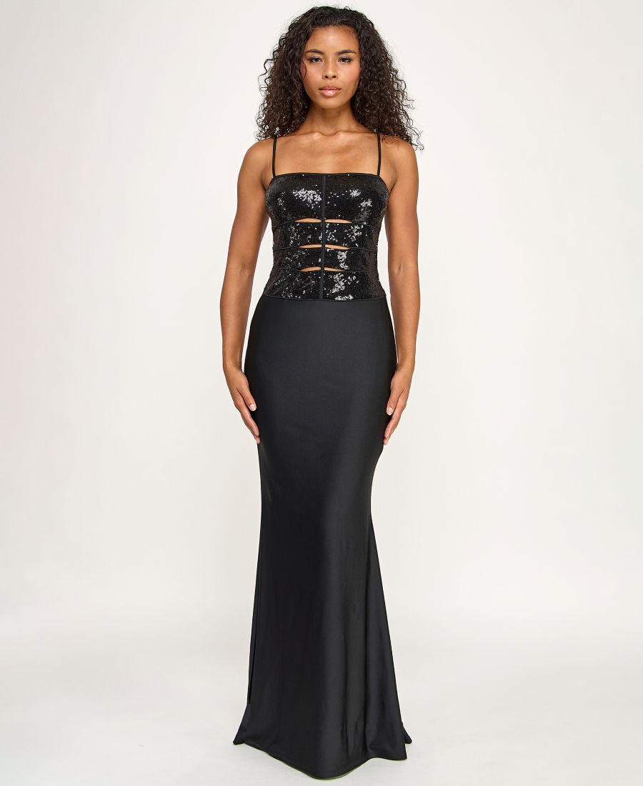 Платье SENI & CADE с разрезами на облегающем лифе украшено пайетками и имеет тонкие бретельки. Длинная узкая юбка создает элегантный и современный образ для праздничных вечеринок и выпускного бала.
