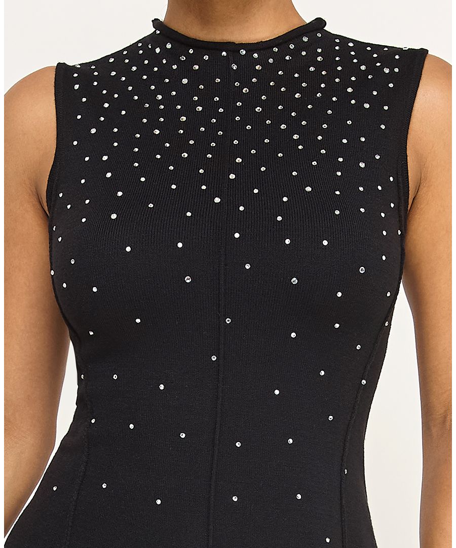 Подарите себе шикарный, непринужденный повседневный стиль с этим платьем-свитером INVITEE, которое отличается воротником-стойкой и отсутствием рукавов. Декоративные камни спереди добавляют блеска.