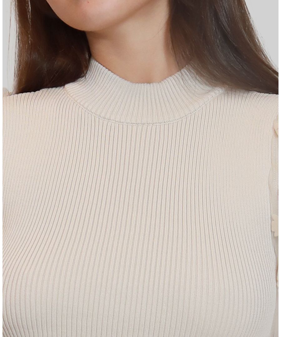 Это романтичное и фактурное платье от Dylan Ryan имеет воротник-стойку и длинные прозрачные ребристые рукава. Декоративная отделка в виде цветов добавляет образу нежности и женственности.
