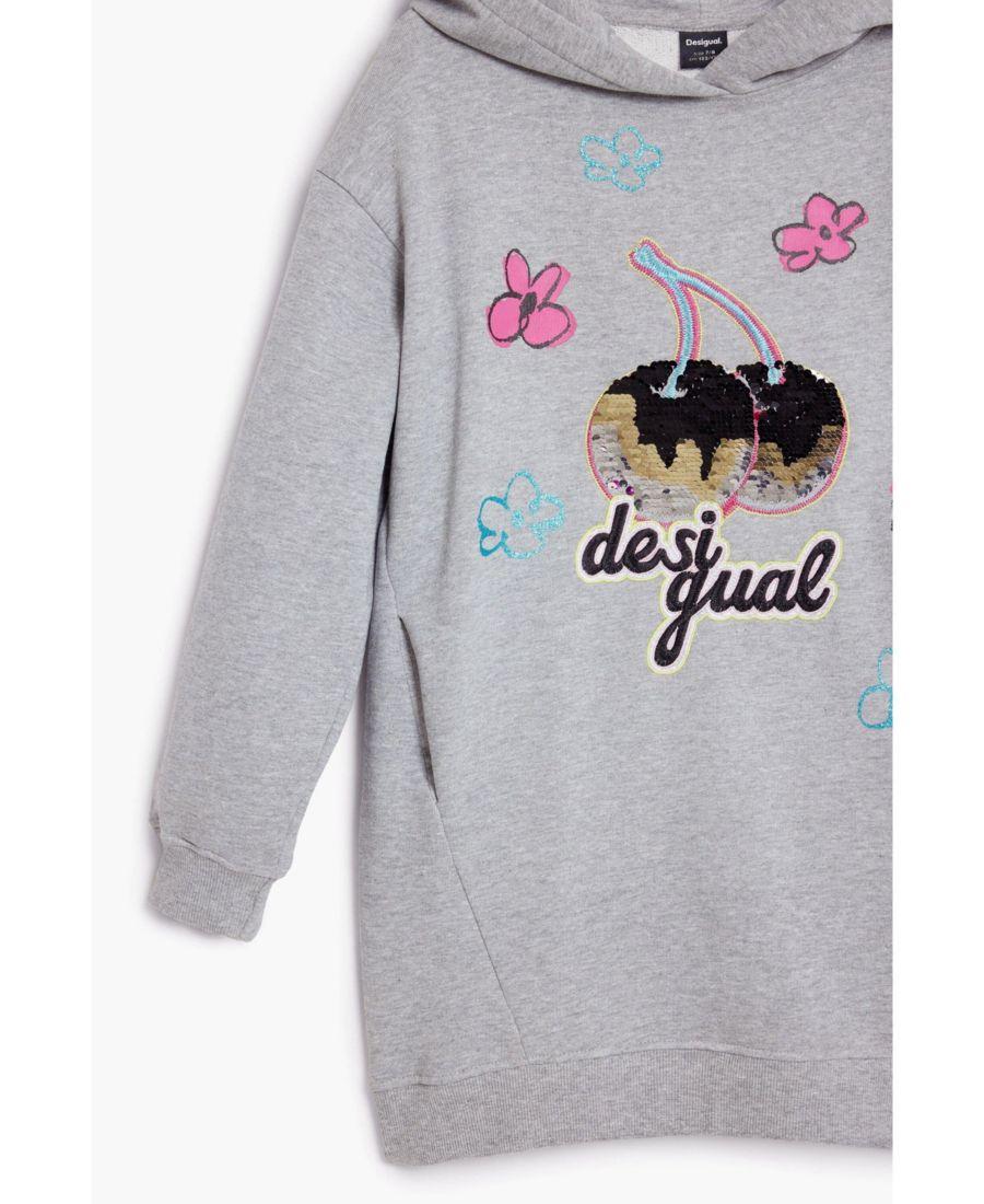 Платье с длинными рукавами, в стиле толстовки, с капюшоном, однотонное, с принтом в виде вишен и логотипом, украшенным пайетками.