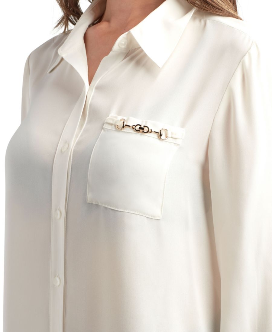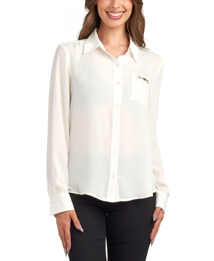 Сохраняйте элегантность и уверенность в себе в этой рубашке BCX с воротником, застежкой на пуговицы, карманом и декоративной отделкой. Длинные рукава придают ей завершенный, изысканный вид.