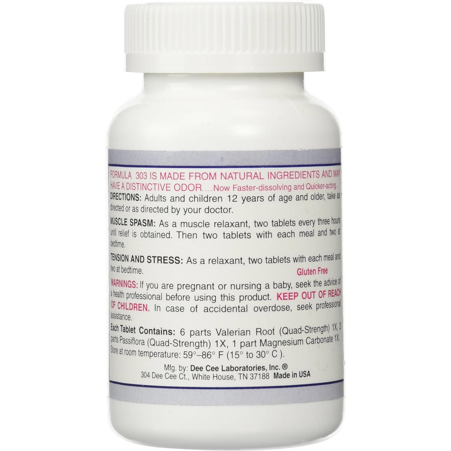 Полностью натуральный релаксант Dee Cee Laboratories Formula 303, содержащий магний для снятия боли в мышцах, цветок страстоцвета и корень валерианы.