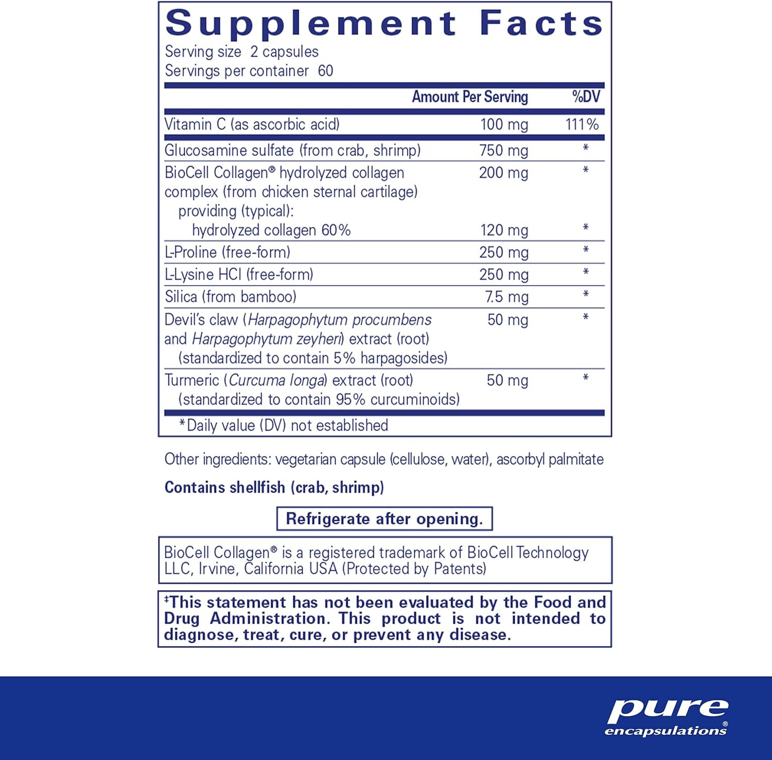 Каждая порция (2 капсулы) содержит: витамин С (в виде аскорбиновой кислоты) 100 мг, сульфат глюкозамина (из крабов, креветок) 750 мг, гидролизованный коллагеновый комплекс BioCell Collagen (из куриного хряща) 200 мг, L-пролин (свободный). форма) 250 мг, L-лизин HCl (свободная форма) 250 мг, диоксид кремния (из бамбука) 7,5 мг, экстракт когтя дьявола (корень) 50 мг, экстракт куркумы (корень) 50 мг. Дополнительные ингредиенты: вегетарианская капсула (целлюлоза, вода), аскорбилпальмитат. Содержит моллюсков (крабов, креветок).