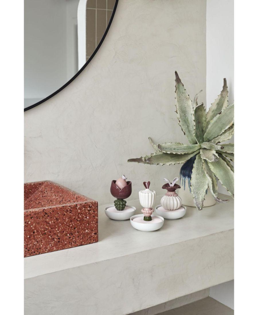 Фарфоровый диффузор, вдохновленный природой. Цветок на диффузоре выполнен из глазурованного фарфора, а основание - из пористого матового фарфора, с использованием специальной формулы, позволяющей аромату, нанесенному на основание, распространяться в помещении.
