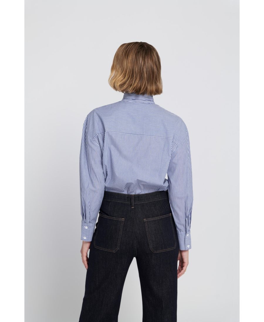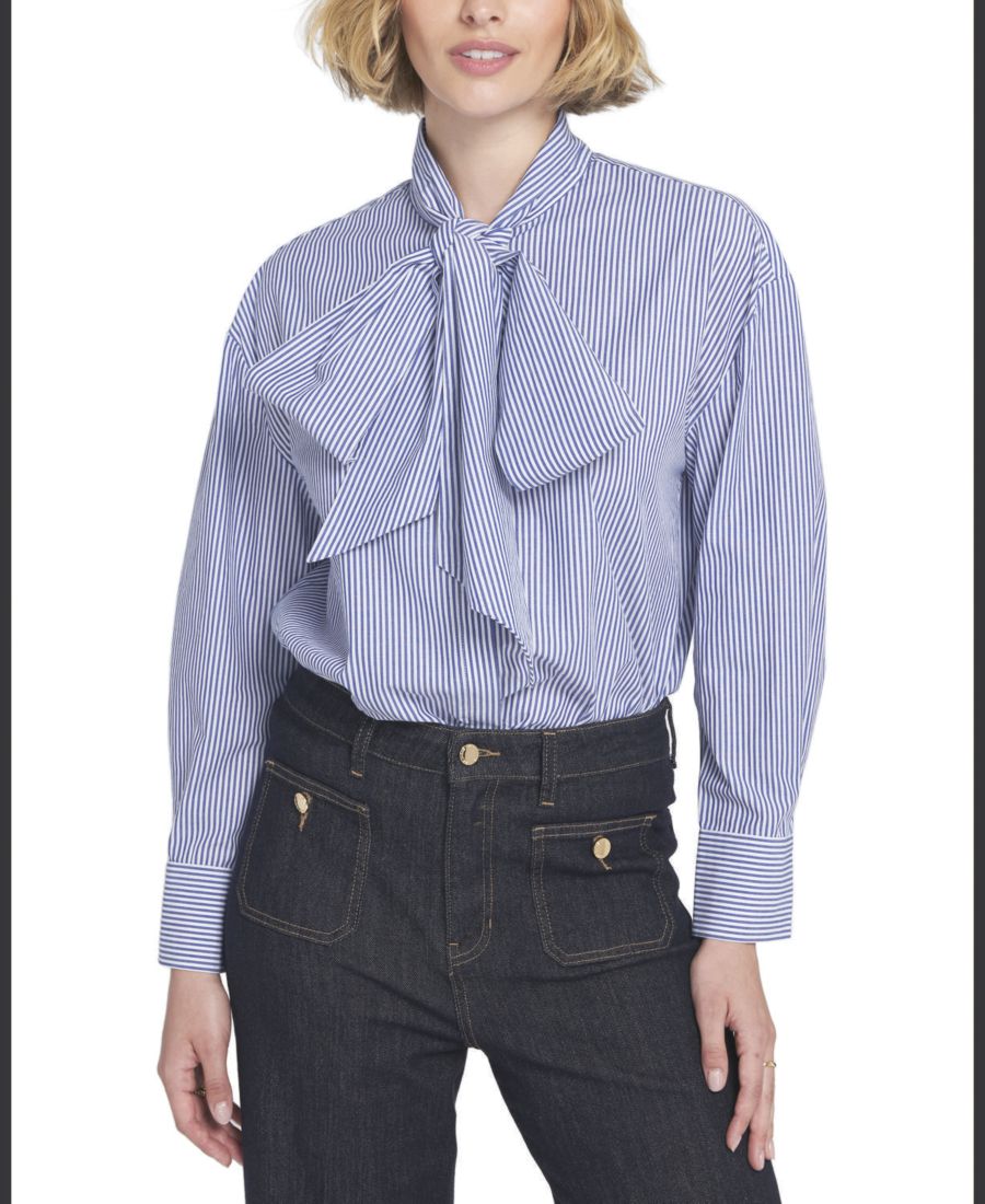Эта блузка украшена эффектным бантом на вырезе, который добавляет драматизма, сохраняя при этом элегантный и изысканный силуэт. Изготовленная из плотной рубашковой ткани с легкой структурой, она обеспечивает изысканный, сшитый по фигуре вид. Классические полоски придают ей современный вид, а застежка на пуговицы позволяет носить ее как заправленной, так и навыпуск. Длинные рукава с широкими манжетами добавляют шик и элементы мужского стиля, делая эту блузку идеальной как для работы, так и для ужина, как в многослойном образе, так и в качестве самостоятельной вещи.