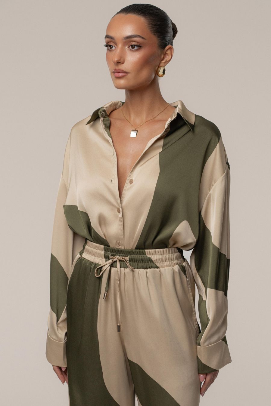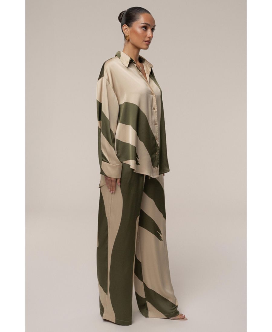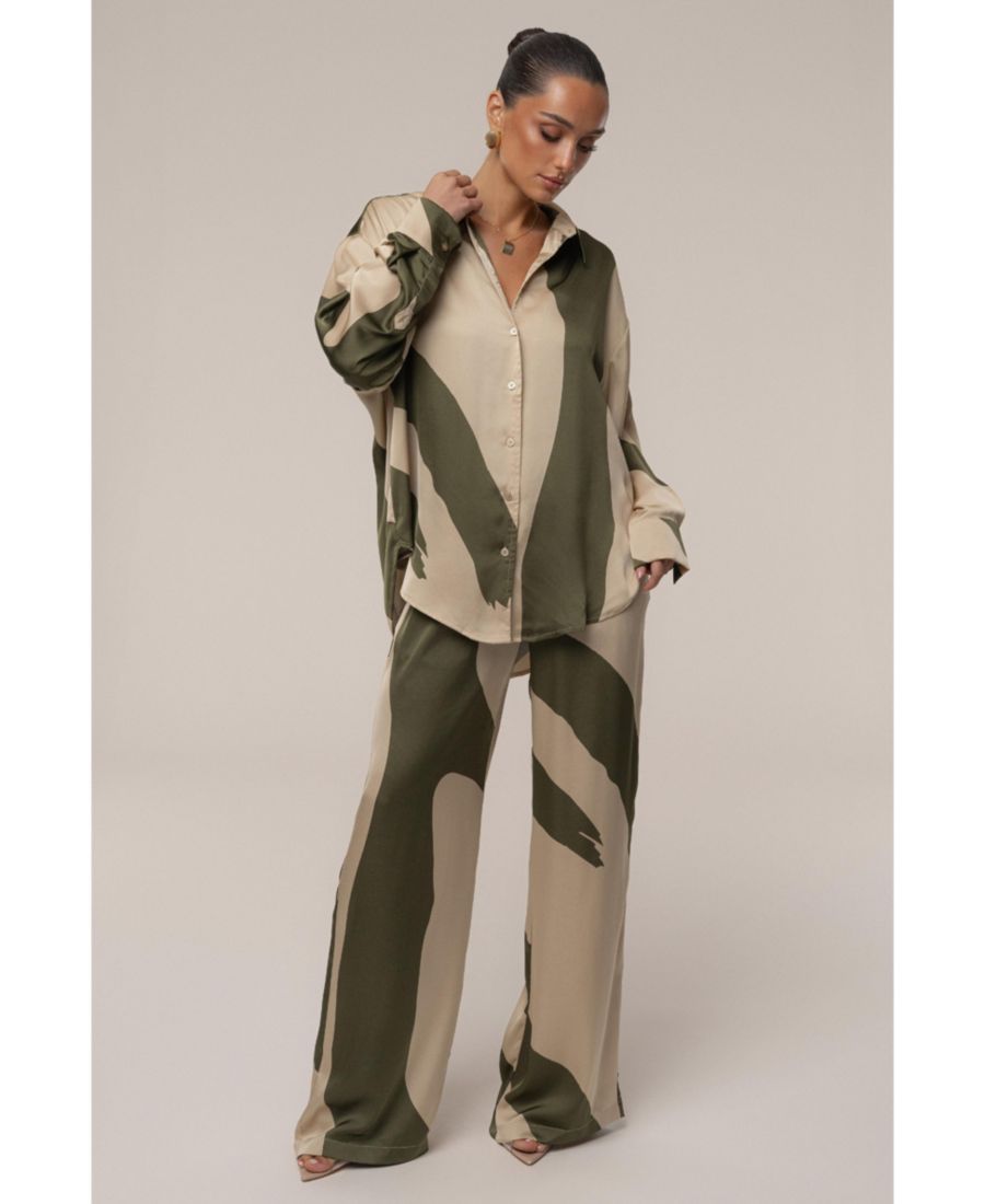 Представляем блузку Ella Safari - ваш новый незаменимый элемент летнего гардероба. Эта блузка с длинными рукавами, украшенная привлекательным абстрактным принтом в оливково-зеленых и бежевых тонах, изготовлена из гладкой, похожей на атлас ткани. Благодаря свободному силуэту, классическому воротнику и манжетам на рукавах, это универсальная вещь, идеально подходящая для любого случая. На одной подкладке.