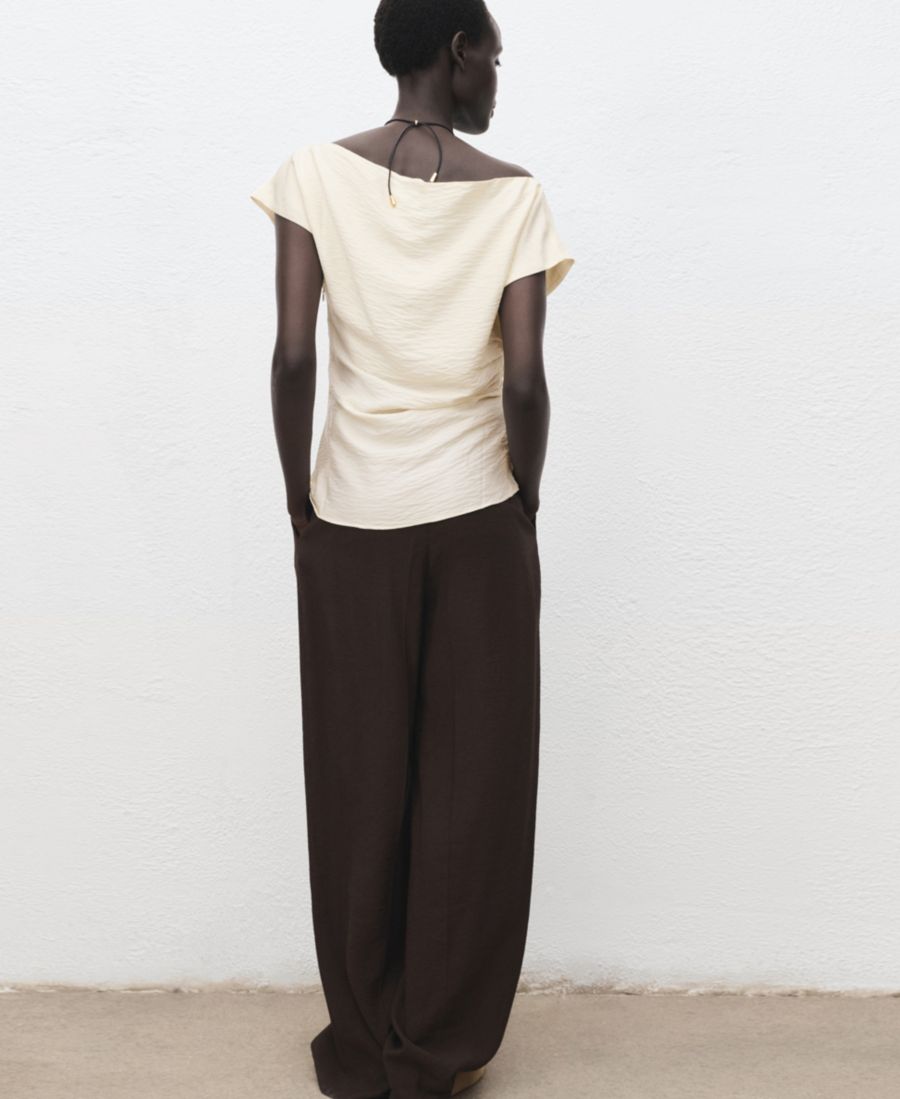 В блузке из модала с асимметричным воротником от Mango современный крой сочетается с текстурой. Эта блузка, изготовленная из фактурной модальной ткани, имеет приталенный крой, асимметричный вырез горловины, короткие рукава, боковые сборки и застежку-молнию сбоку.