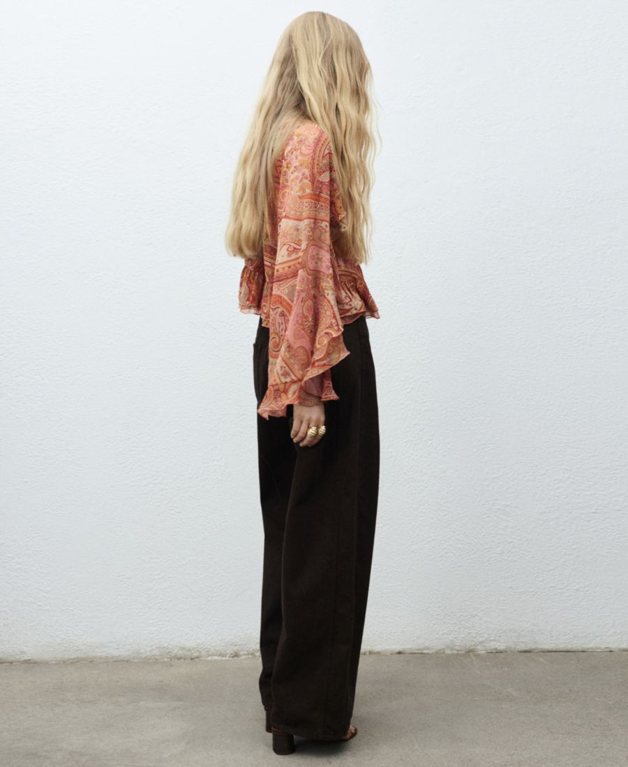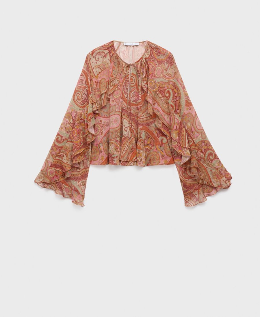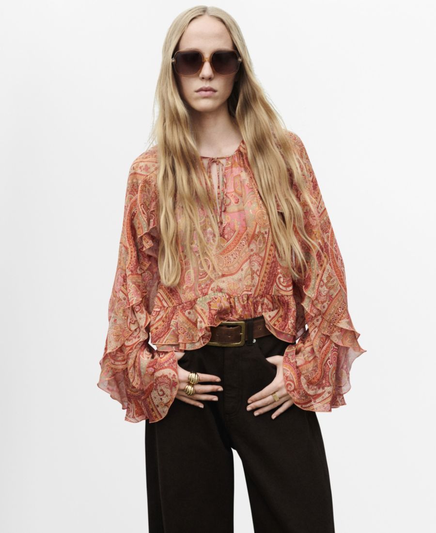 Блузка с принтом и оборками от Mango отличается свободными линиями. Эта блузка оверсайз, выполненная из гладкой ткани, имеет узор пейсли, круглый вырез, длинные расклешенные рукава с оборками и завязку на шее.