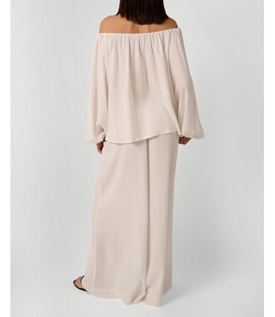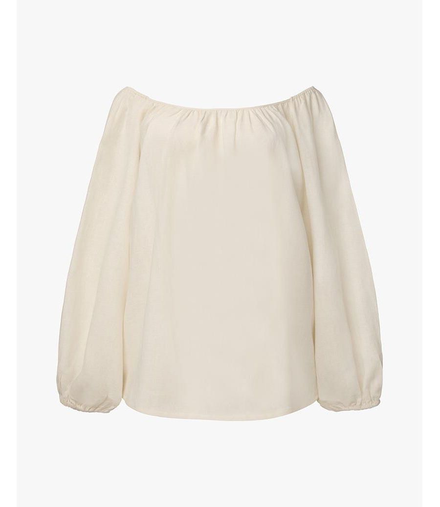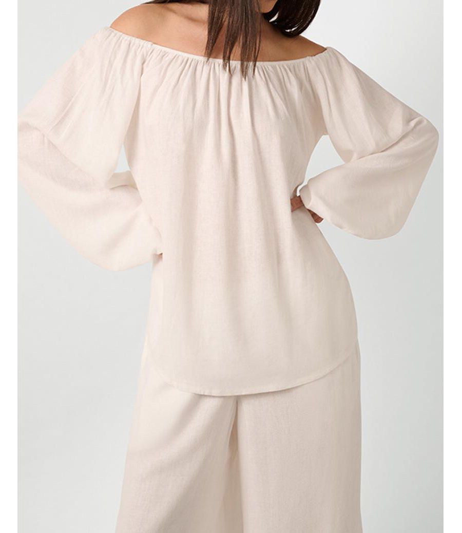 Этот льняной топ с открытыми плечами имеет расклешенный крой, вшитую эластичную резинку вдоль выреза горловины сзади и манжеты, которые придают ему свободный силуэт.