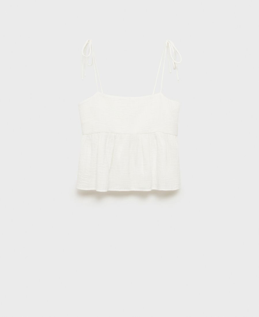 В хлопковом топе с оборками от Mango сочетаются фактура и объем. Этот укороченный топ с тонкими бретелями, застегивающимися на бант, и эластичной сборкой на спине.