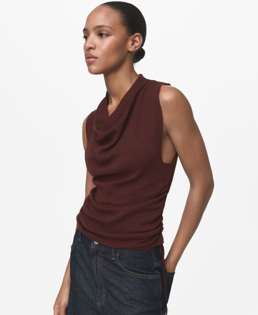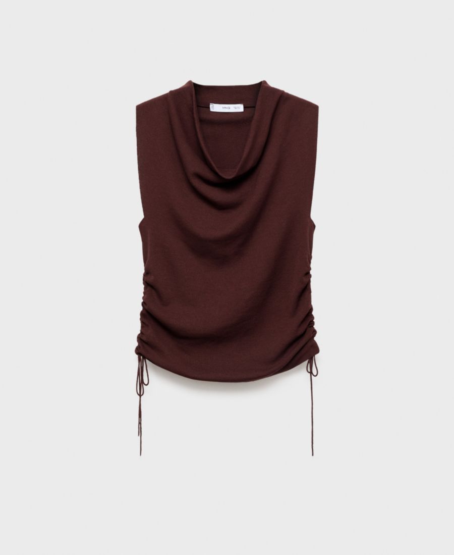 Изящная драпировка отличает вязаный топ с присборенной талией от Mango. Изготовлен из тонкой трикотажной ткани.