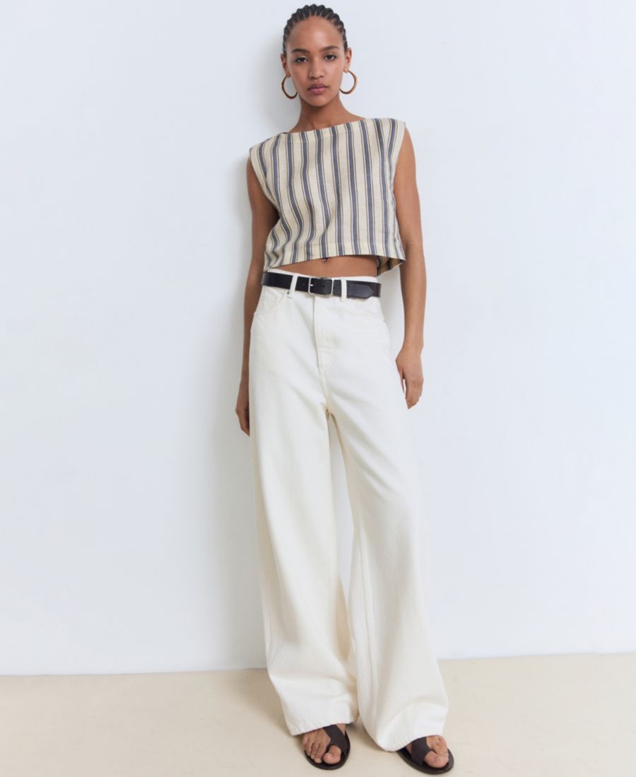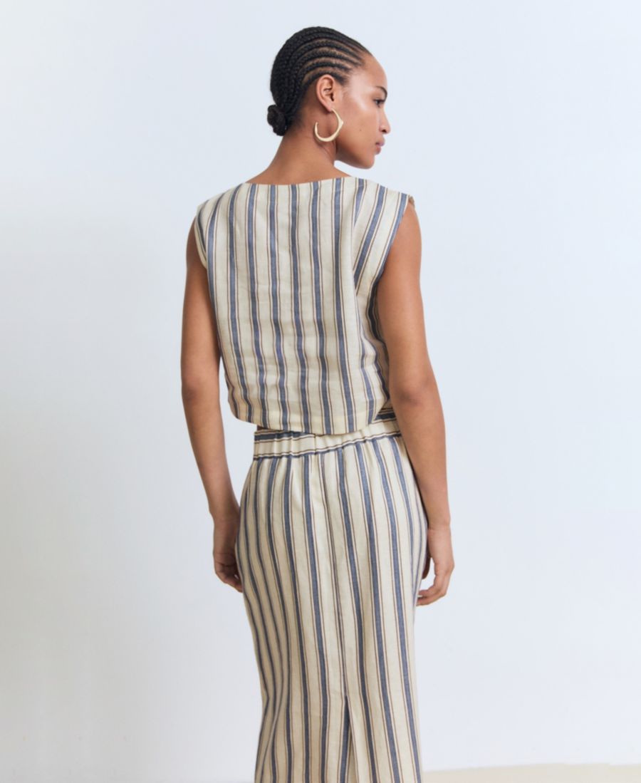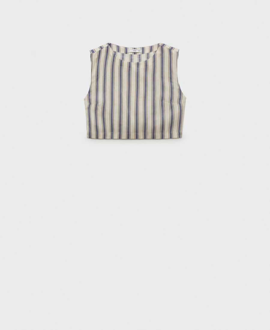 Льняной топ в полоску от Mango, выполненный в лаконичном стиле, отличается воздушной структурой.