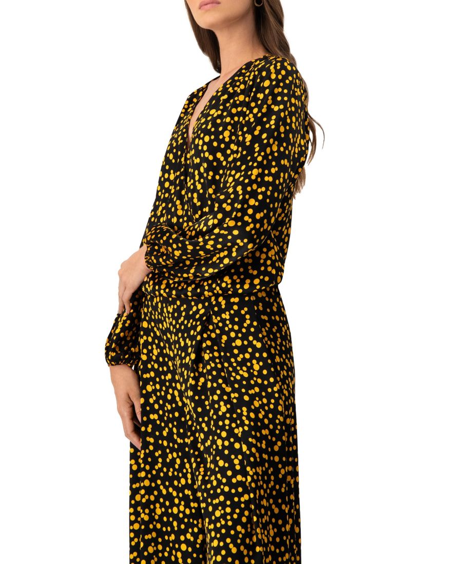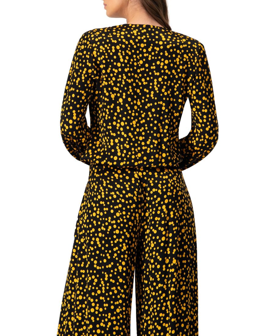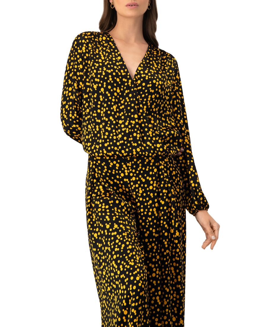 Прямая блузка в горошек с длинными рукавами и V-образным вырезом.