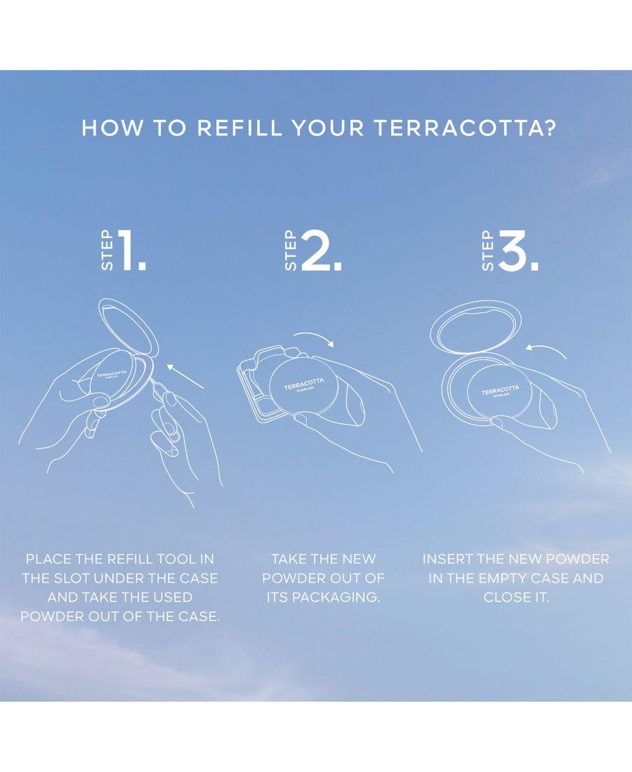 ЧТО ЭТО: Легендарная бронзирующая пудра, которая создает безупречный, естественный бронзовый оттенок за один шаг. ЧТО ОНА ДЕЛАЕТ: Обеспечивает стойкое и комфортное покрытие. ОСНОВНЫЕ ИНГРЕДИЕНТЫ: Марокканское аргановое масло питает и увлажняет, обеспечивая комфортное, не пересушивающее кожу покрытие; пигменты с люминесцентным мерцанием придают загорелый бронзовый оттенок на весь день. ТИПЫ КОЖИ: Подходит для всех типов кожи. СПОСОБ ПРИМЕНЕНИЯ: Заполните свой футляр Terracotta одним простым шагом: когда пудра закончится, поместите инструмент для заправки в слот под футляром и поднимите использованную пудру, пока она не выйдет из футляра, затем вставьте новый футляр и закройте футляр. Этот продукт способствует сокращению отходов, поскольку выпускается как в оригинальном (многоразовом), так и в сменном формате.