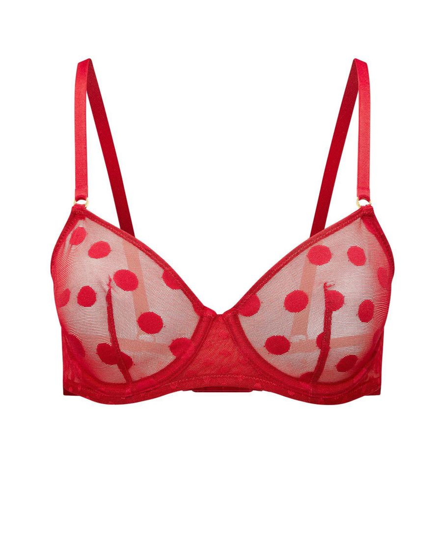 Этот прозрачный сетчатый бюстгальтер без подкладки - более зрелая интерпретация игривого тренда. Он имеет сетчатый узор в два точечного рисунка, поддерживающий каркас и застежку на крючки.