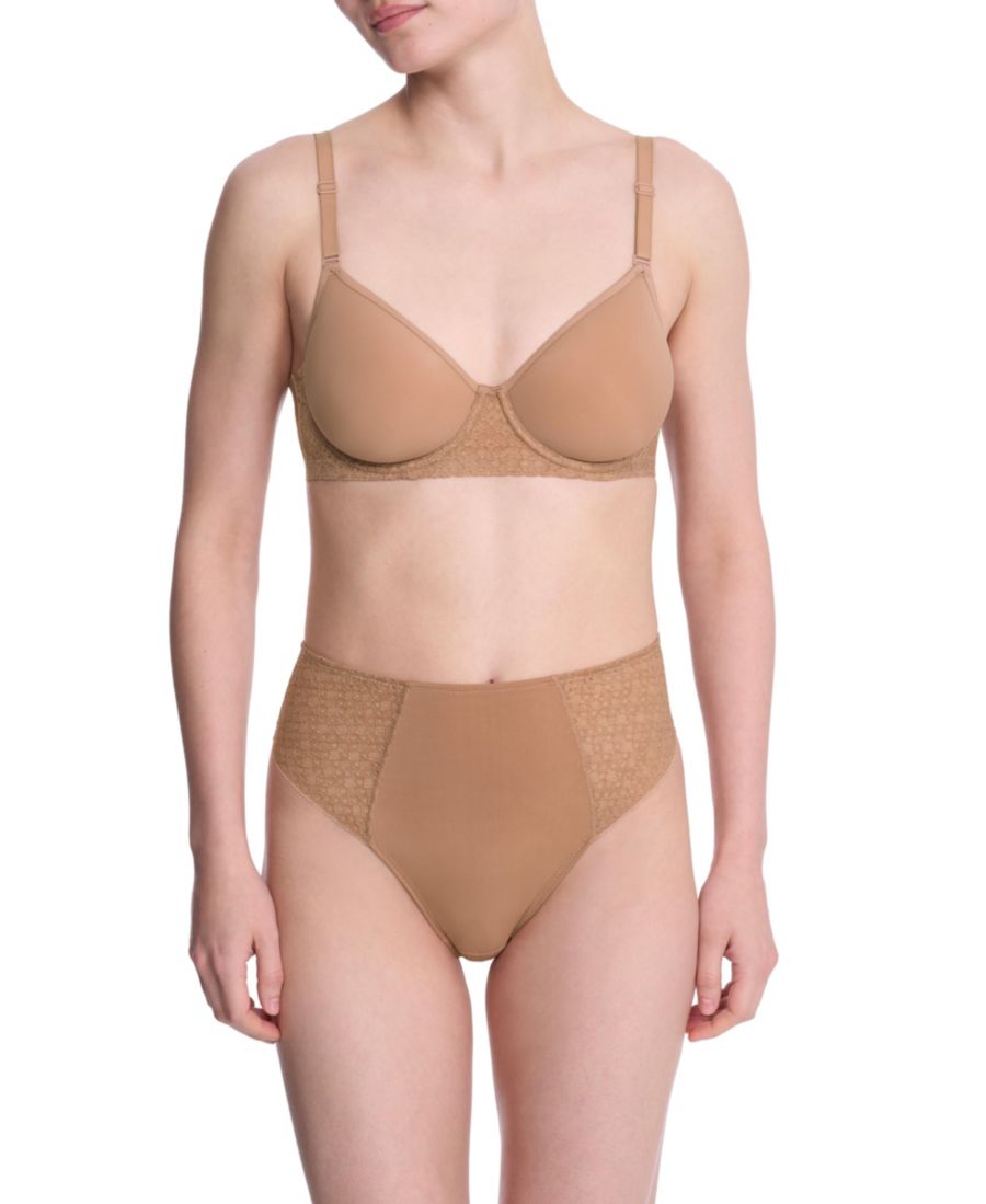 Нижние чашки имеют подкладку для поддержки и бесшовного прилегания к телу. Верхние чашки без подкладки, с эластичным кружевом и резинкой в области декольте