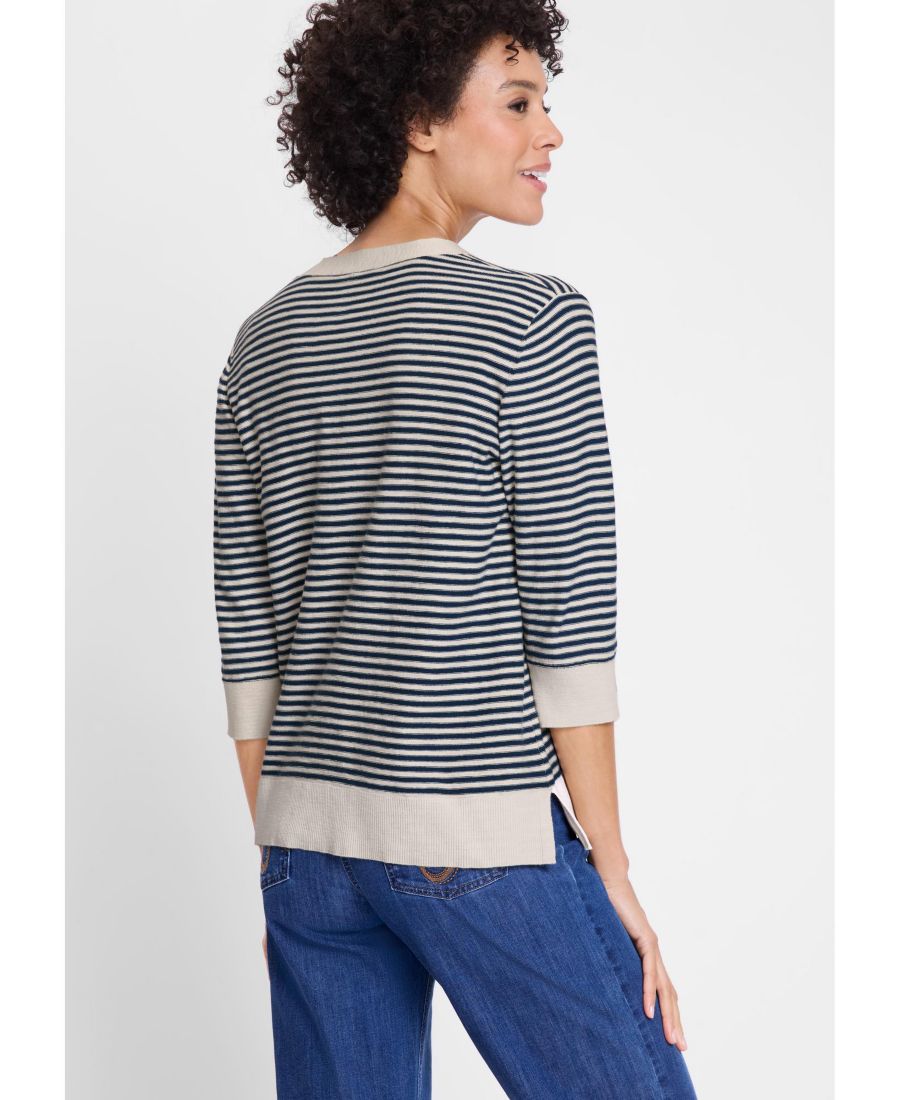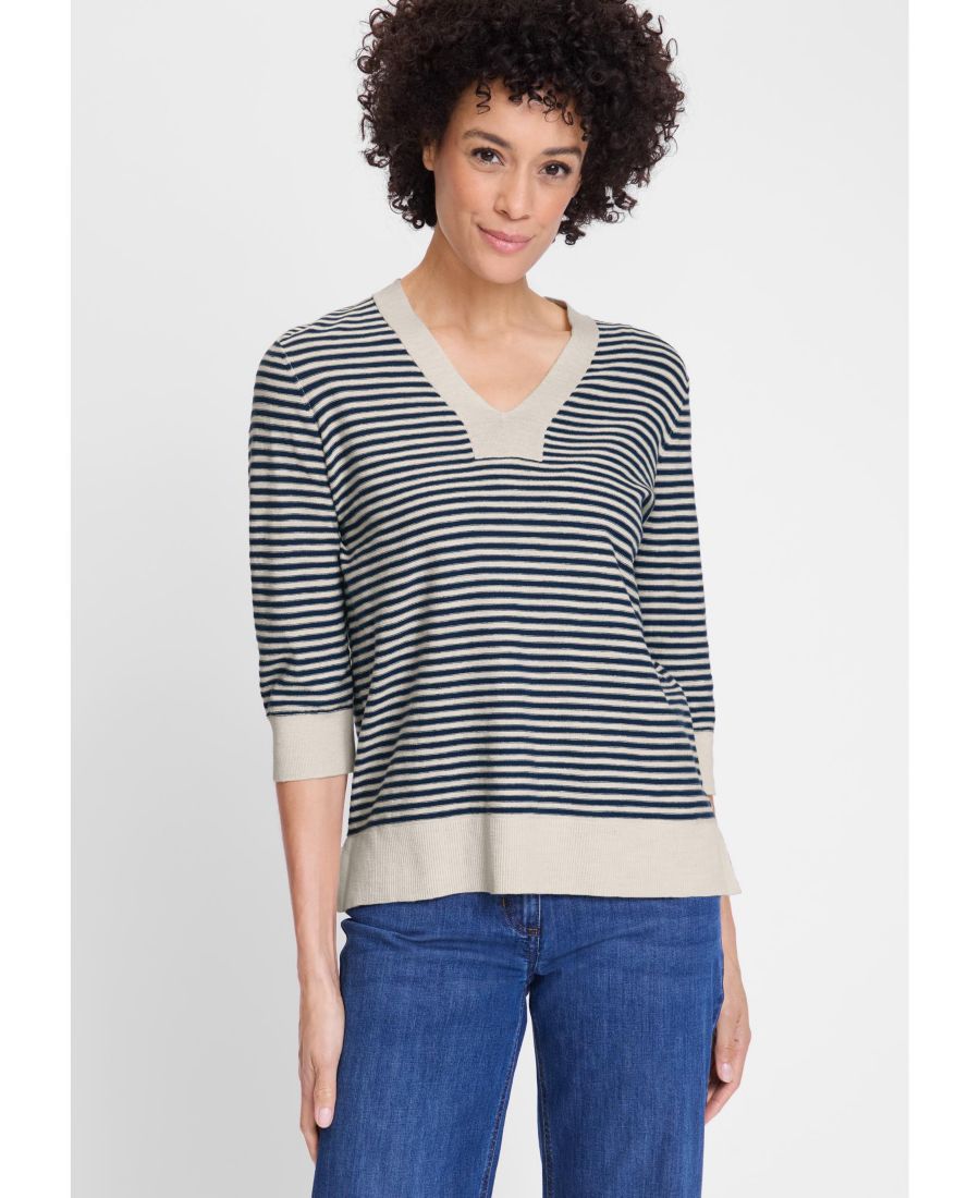 Этот легкий свитер-туника, который станет вневременным дополнением вашего гардероба, имеет округлый V-образный вырез, сбалансированные бретонские полоски и однотонную окантовку.