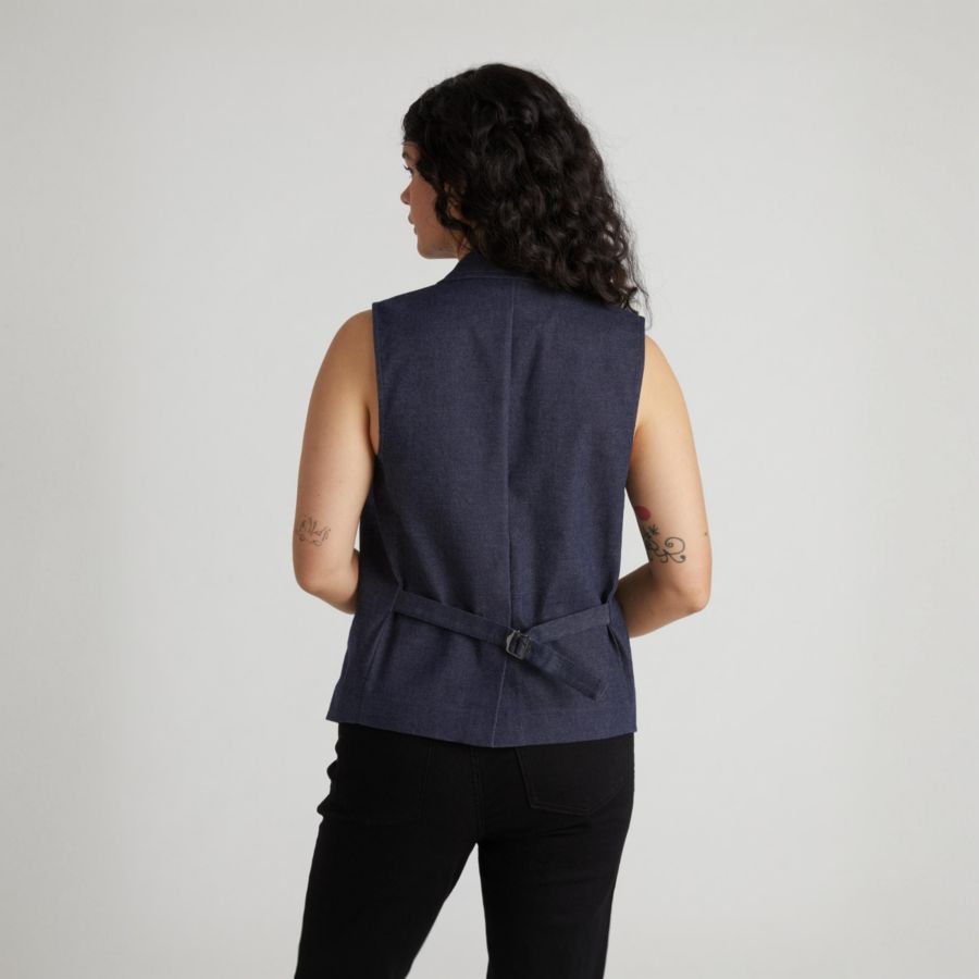 Созданный на основе нашего бестселлера - льняного жилета, этот жилет с эффектом джинсовой ткани прекрасно подходит как для ношения в качестве жилета, так и в качестве топа. Идеально подходит для многослойных образов или ношения отдельно, он предлагает более элегантный и стильный вариант традиционного денима и легко сочетается с подходящими пиджаками или брюками. Жилет облегает фигуру, но не стесняет движений, а передняя часть имеет подкладку для дополнительного комфорта. Скрытые кнопки между пуговицами обеспечивают аккуратный и безупречный вид. Доступен в широком диапазоне размеров и разработан для универсальности и стиля.