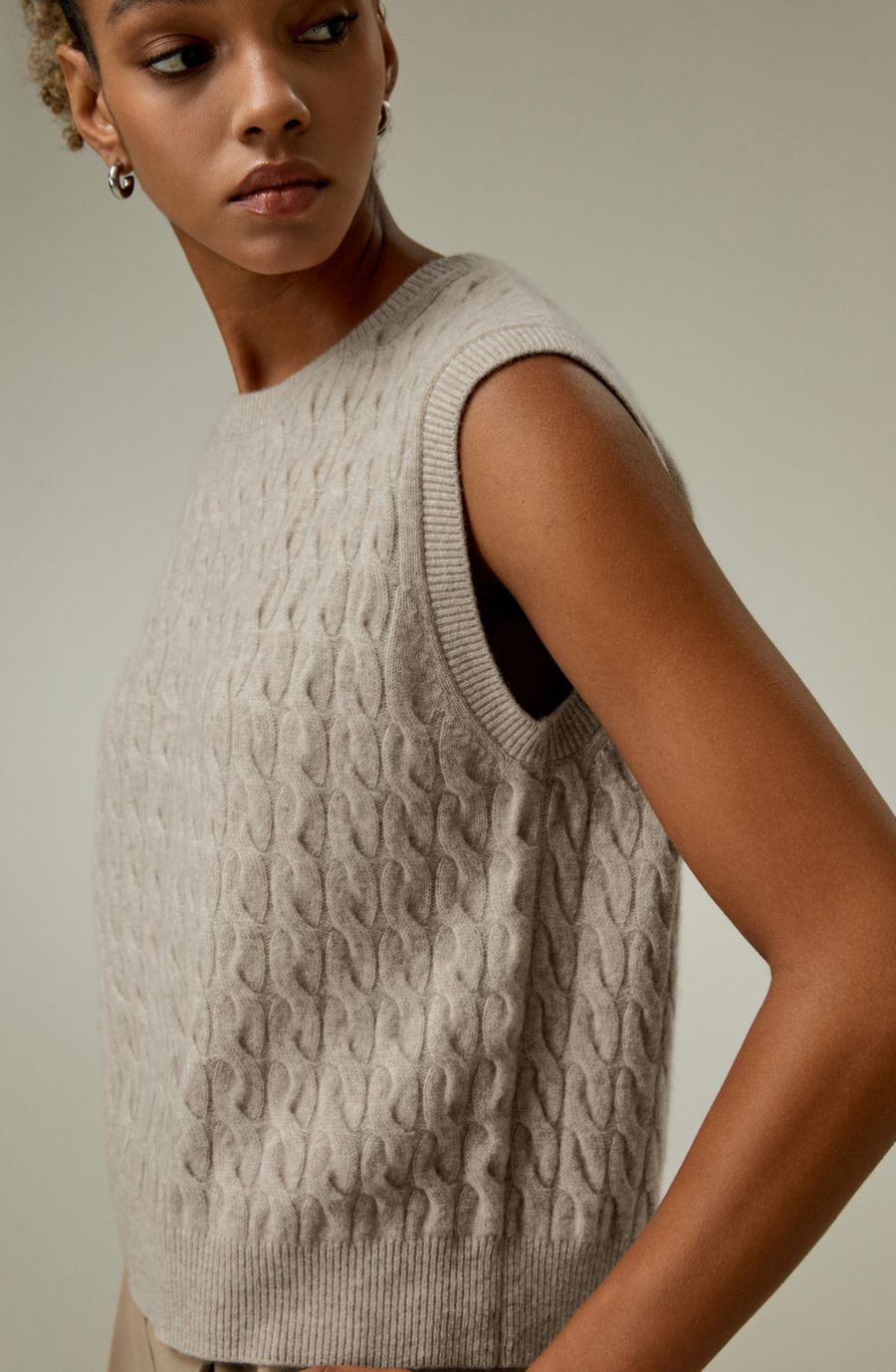Обновите свой гардероб с помощью нашего уютного укороченного жилета с косами. Изготовленный из 100% детского кашемира, он невероятно мягкий и удобный. Жилет стандартного кроя имеет круглый вырез и ребристую отделку на воротнике, проймах и подоле, а детальная вязка косами обязательно привлечет внимание. Носите его отдельно для классического образа или наденьте поверх рубашки для создания университетского или спортивного стиля. Этот универсальный жилет - обязательный элемент вашего гардероба.