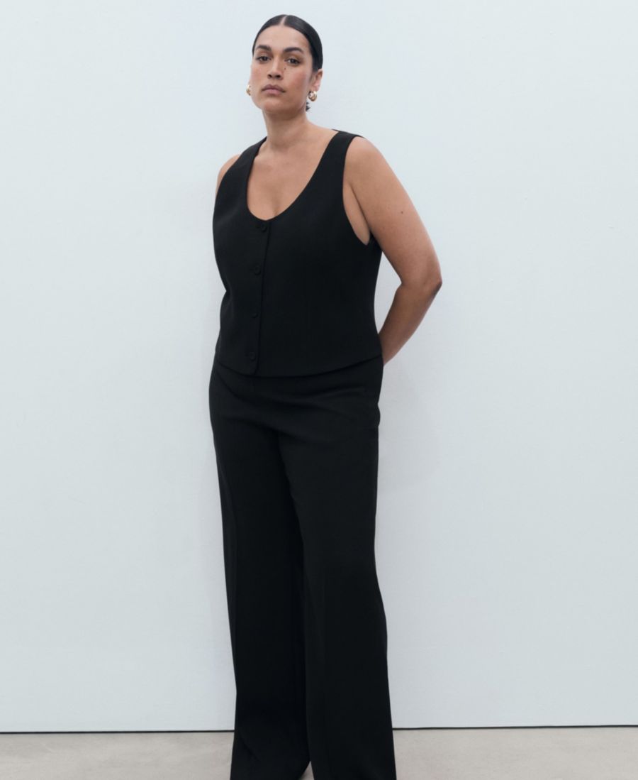 Структурированный и универсальный жилет для костюма с пуговицами от Mango предлагает изысканные варианты для многослойных образов. Этот жилет для костюма имеет прямой крой с открытым круглым вырезом, без рукавов, широкими бретелями, застежкой на пуговицы спереди и внутренней подкладкой.