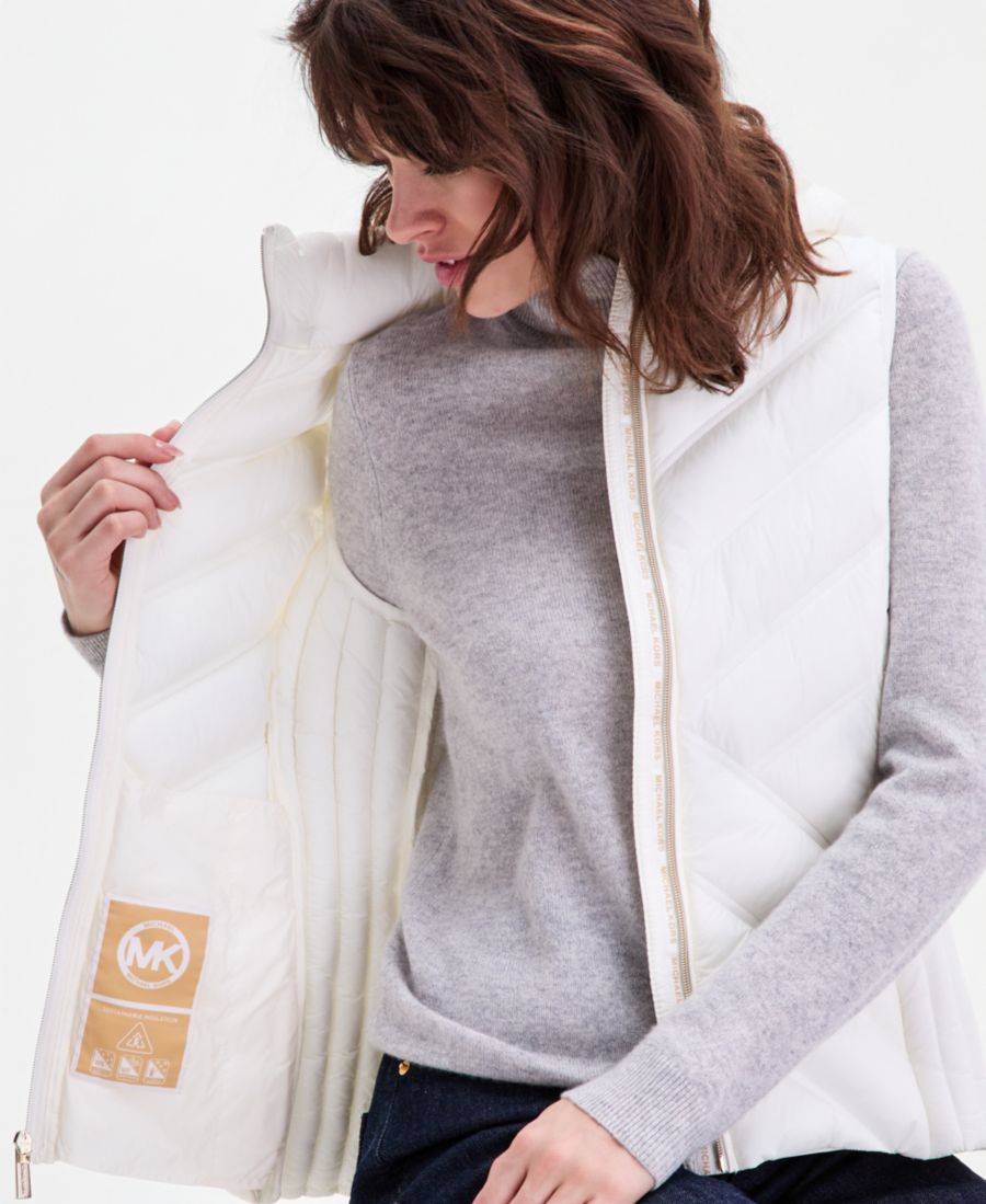 Согрейтесь и наслаждайтесь теплом в этом стильном жилете от MICHAEL Michael Kors: фактурном пуховом жилете с воротником-стойкой и капюшоном.