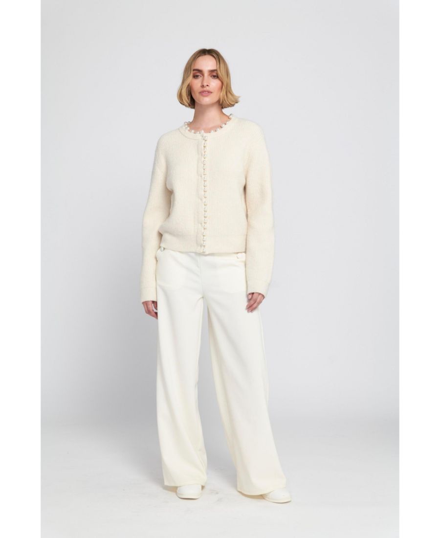 Этот вневременной кардиган украшен декоративной жемчужной вышивкой, которая придает ему женственный и утонченный вид. Ребристая трикотажная текстура обеспечивает мягкую структуру, сохраняя при этом уютный и свободный силуэт. Застежка на пуговицы спереди с жемчужными акцентами создает аккуратный и элегантный вид, а классический круглый вырез горловины позволяет легко носить его как самостоятельно, так и в сочетании с другой одеждой. Слегка укороченный низ на талии создает современный, привлекательный силуэт, который прекрасно сочетается с брюками. Изготовленный из мягкой трикотажной смеси с полиэстером, он обеспечивает комфортную эластичность и непринужденную элегантность.