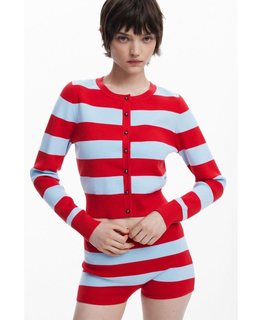 Кардиган с длинными рукавами, круглым вырезом, застежкой на пуговицы спереди и двухцветным полосатым принтом.