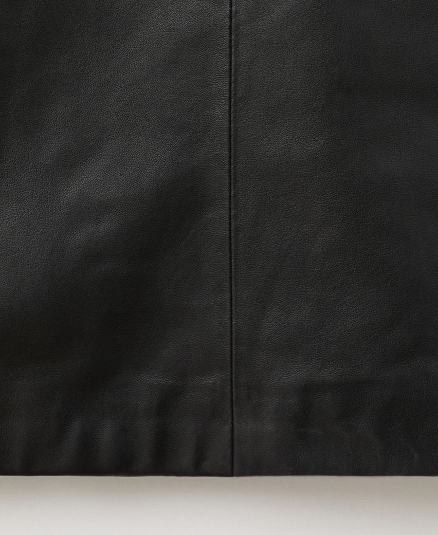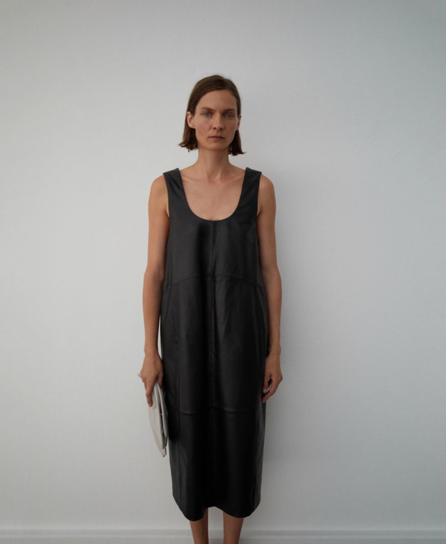 Произведите неизгладимое впечатление в кожаном платье миди от Mango. Это платье средней длины, выполненное из овечьей кожи, имеет прямой крой, широкие бретели, без рукавов и открытую спину.