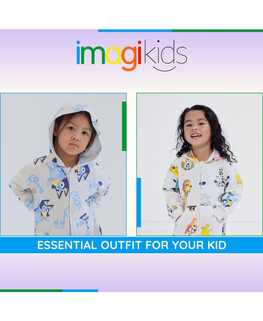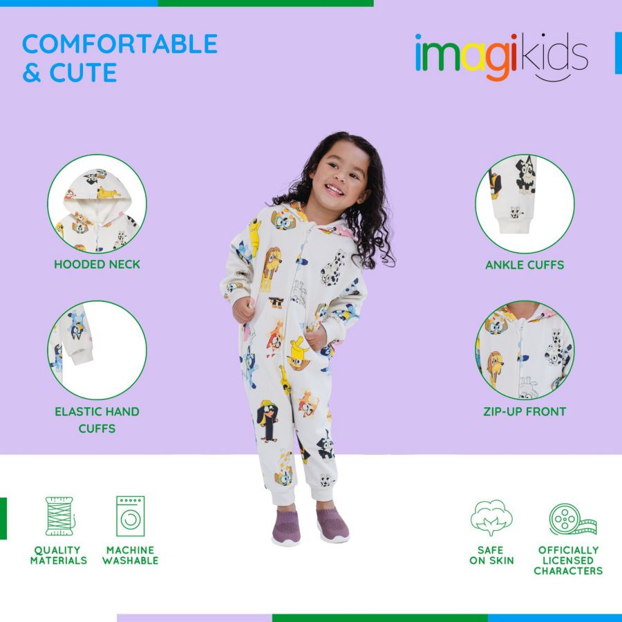Принт по всей поверхности с изображениями Блюи, Бинго, Коко, Хлои, Инди, Лилы, Маккензи, Мисси, Маффина и Сникерса. Ребристые манжеты на рукавах и щиколотках для лучшей посадки. Застежка-молния спереди для удобства одевания. Удобный и теплый передний карман-кенгуру.