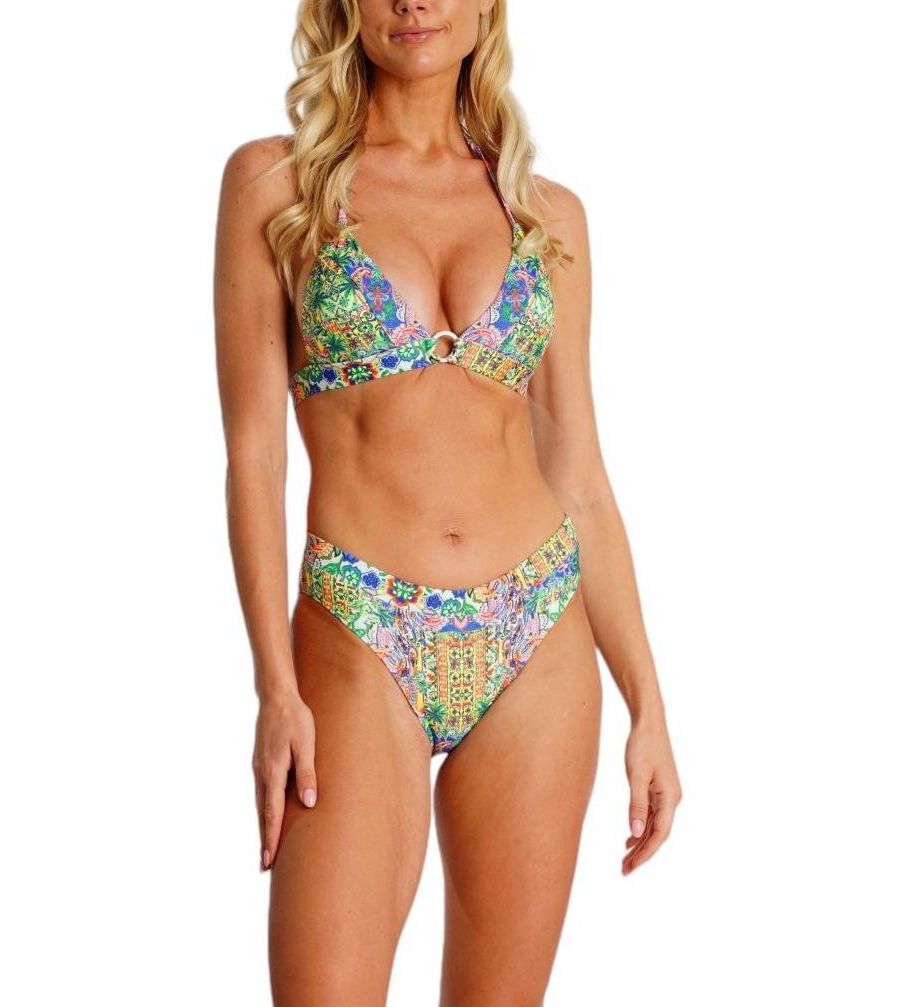 Женский разноцветный комплект бикини с регулируемыми бретелями и трусиками со средней посадкой и принтом, идеально подходящий для отдыха на курорте и пляжного дня.