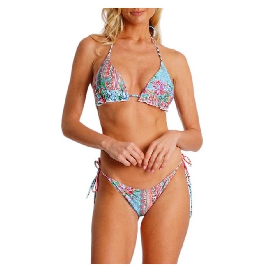 Женский разноцветный комплект бикини с регулируемыми бретелями и трусиками со средней посадкой и принтом, идеально подходящий для отдыха на курорте и пляжного дня.
