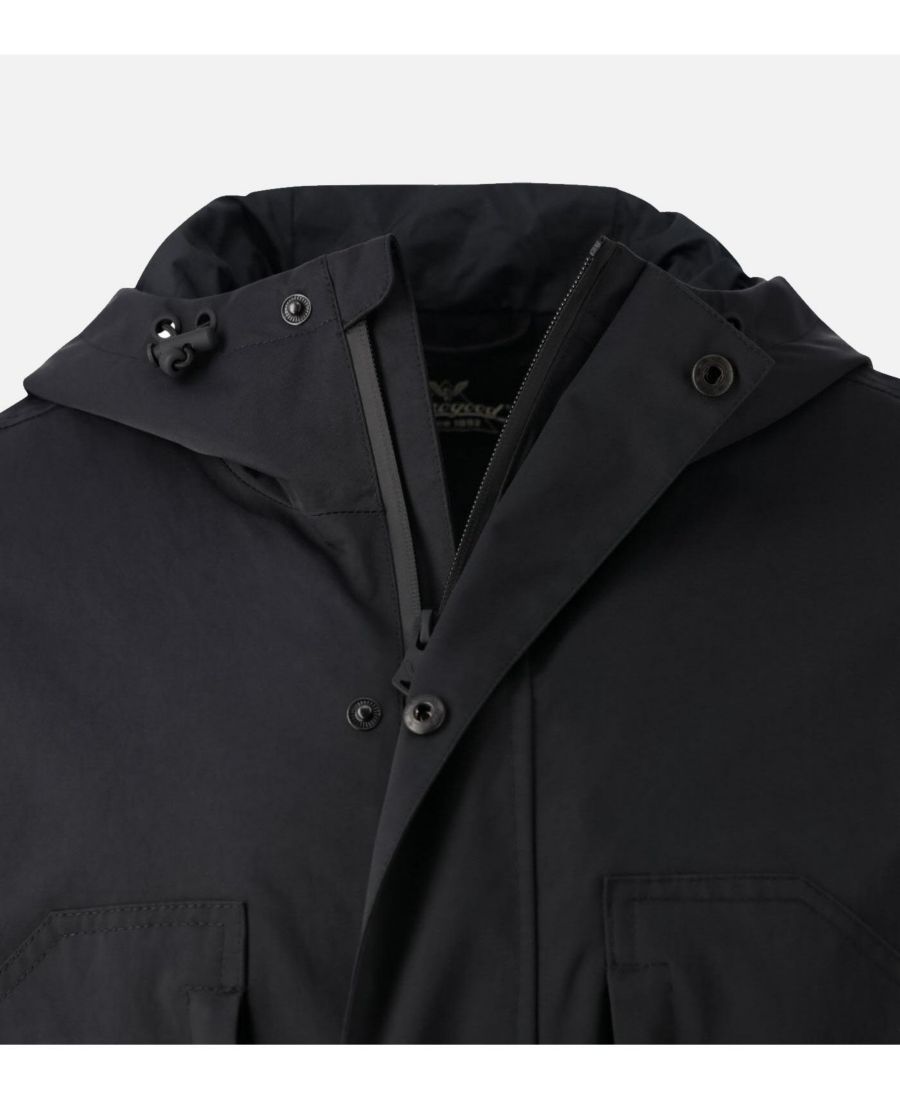 Водонепроницаемая нейлоновая саржа с влагоотводящей подкладкой из полиэстеровой понжи Нагрудные накладные карманы с вертикальной скрытой застежкой-молнией с водонепроницаемой лентой и нижним верхним накладным карманом, скрытая застежка на кнопках на клапане, а также боковые карманы для рук с прорезиненными заклепками с логотипом в верхних углах Планка со скрытой водонепроницаемой центральной застежкой-молнией с прорезиненным язычком и металлическими кнопками Регулируемый капюшон и низ с эластичным шнуром и прорезиненным фиксатором, вентиляционные отверстия под мышками для воздухопроницаемости и внутренний прорезной карман на молнии на левой стороне груди 100% нейлон Машинная стирка Импортный товар
