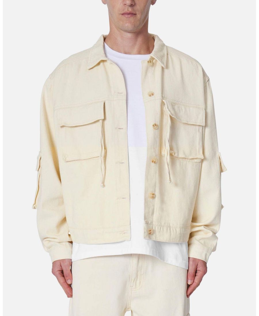 Подчеркните свой стиль с помощью куртки-карго из матовой саржи от mnml. Эта куртка изготовлена из смесовой хлопковой ткани, имеет кремовый базовый оттенок, вместительные накладные карманы вдоль корпуса и рукавов, эффектные застежки-молнии на карманах и пуговицы из искусственной черепаховой скорлупы.