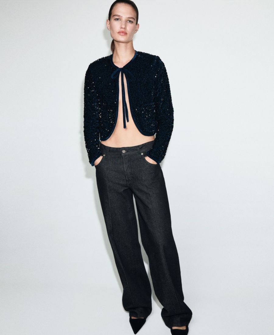 Создайте неповторимый стиль с помощью этой бархатной куртки с пайетками и бантом от Mango. Изготовленная из бархатной ткани с пайетками, она имеет укороченный прямой крой, круглый вырез, длинные рукава и передние карманы.