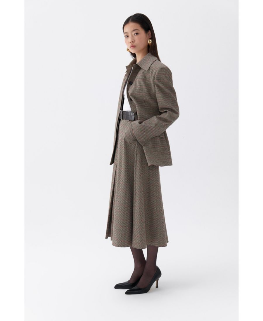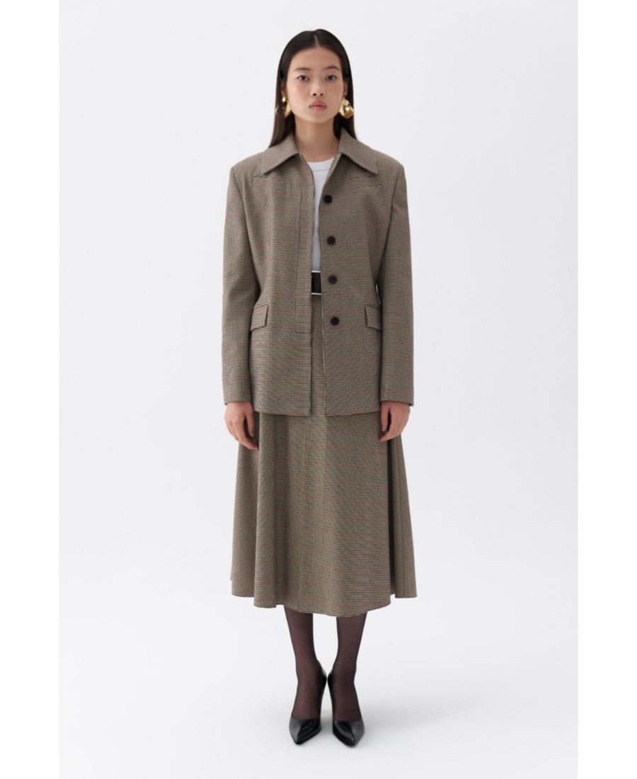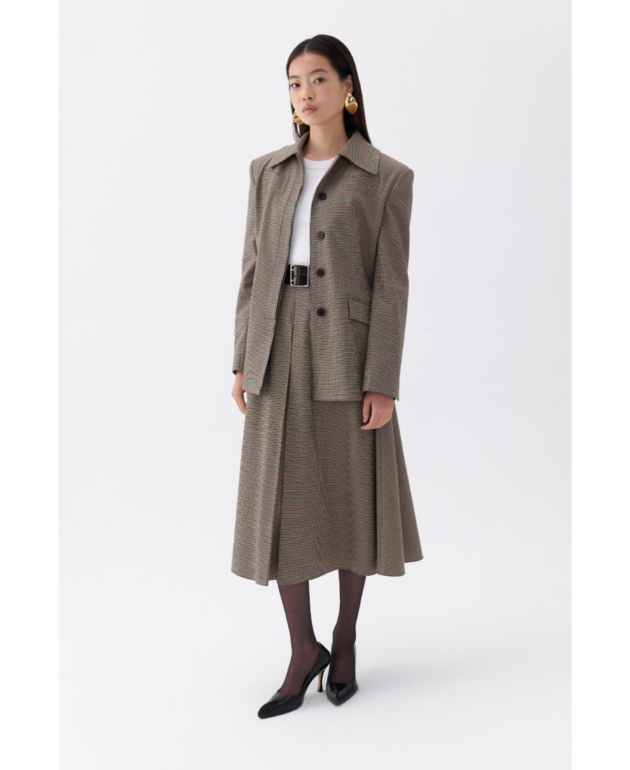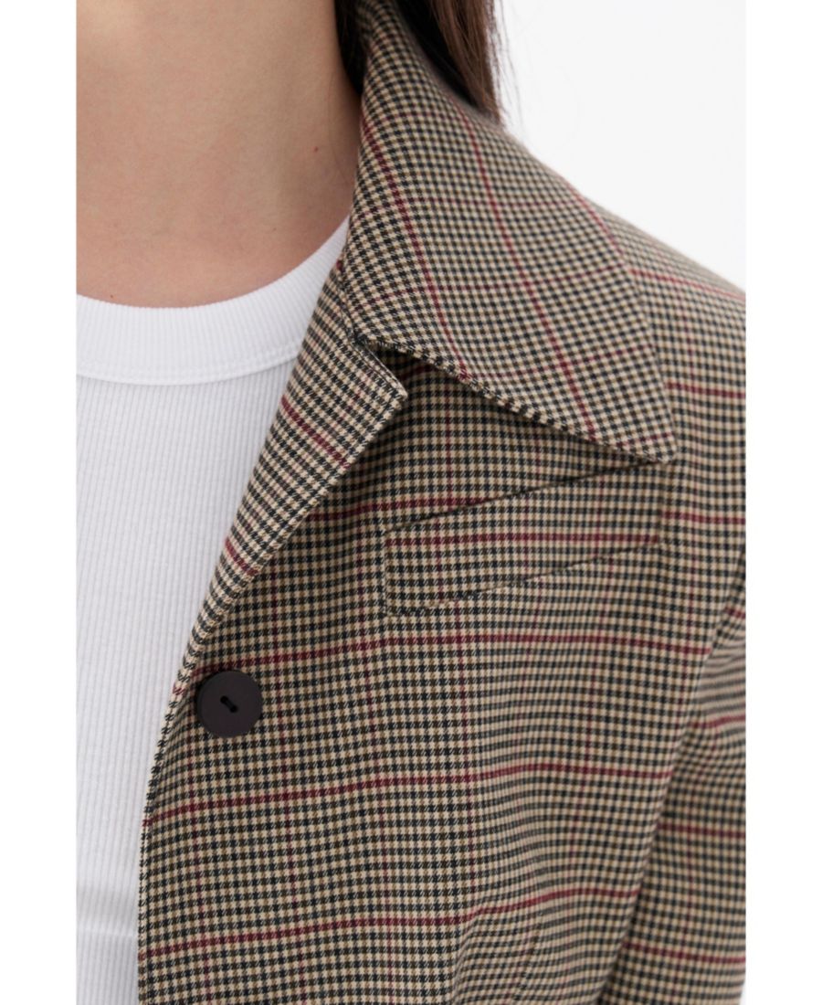 Эта клетчатая куртка, являющаяся визитной карточкой коллекции Nocturne, отличается выразительными подплечниками и застежкой на пуговицы спереди, что создает современный образ.