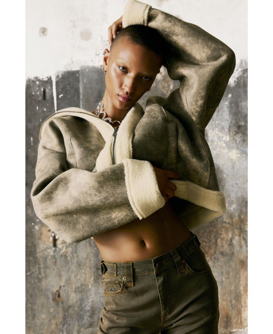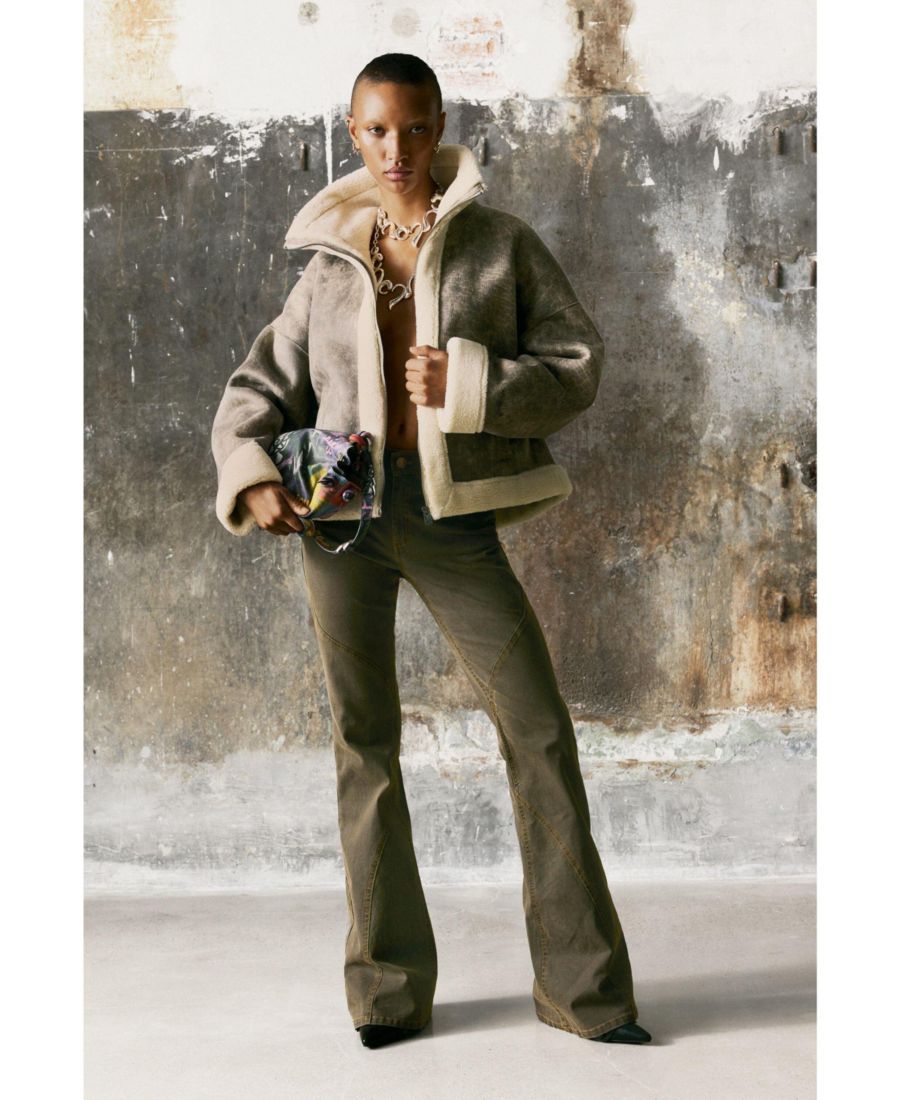 Двусторонняя куртка: внешний слой из ткани с эффектом искусственной кожи, внутренний слой из ткани с меховой текстурой и передние карманы.